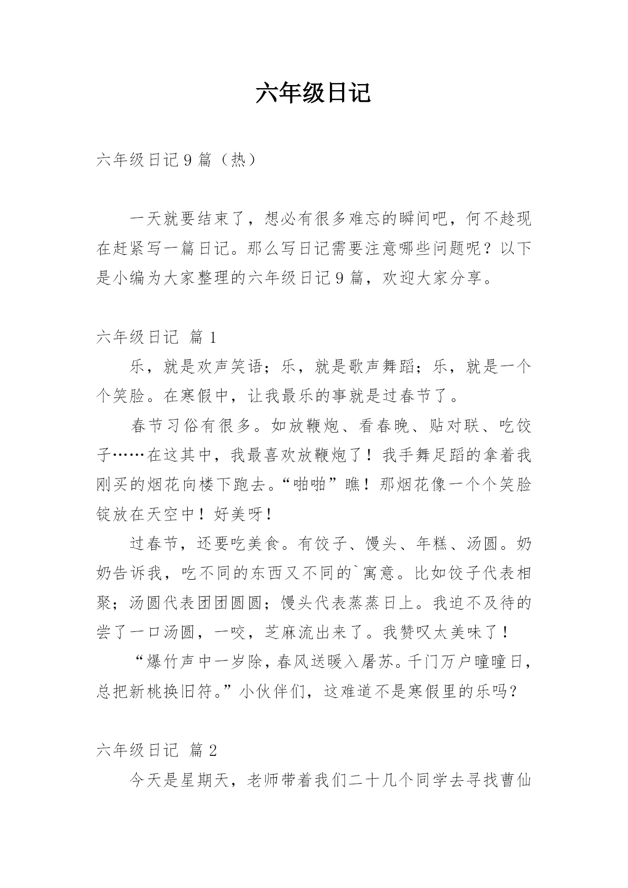 六年级日记六年级日记9篇(热)一天就要结束了,想必有很多难忘的瞬间吧,何不趁现在赶紧写一篇日记。那么写日记需要注意哪些问题呢?以下是小编为大家整理的六年级日记9篇,欢迎大家分享。六年级日记篇1乐,就是欢声笑语;乐,就是歌声舞蹈;乐,就是一个个笑脸。在寒假中,让我最乐的事就是过春节了。春节习俗有很多。如放鞭炮、看春晚、贴对联、吃饺子……在这其中,我最喜欢放鞭炮了!我手舞足蹈的拿着我刚买的烟花向楼下跑去。“啪啪”瞧!那烟花像一个个笑脸锭放在天空中!好美呀!过春节,还要吃美食。有饺子、馒头、年糕、汤圆。奶奶告诉