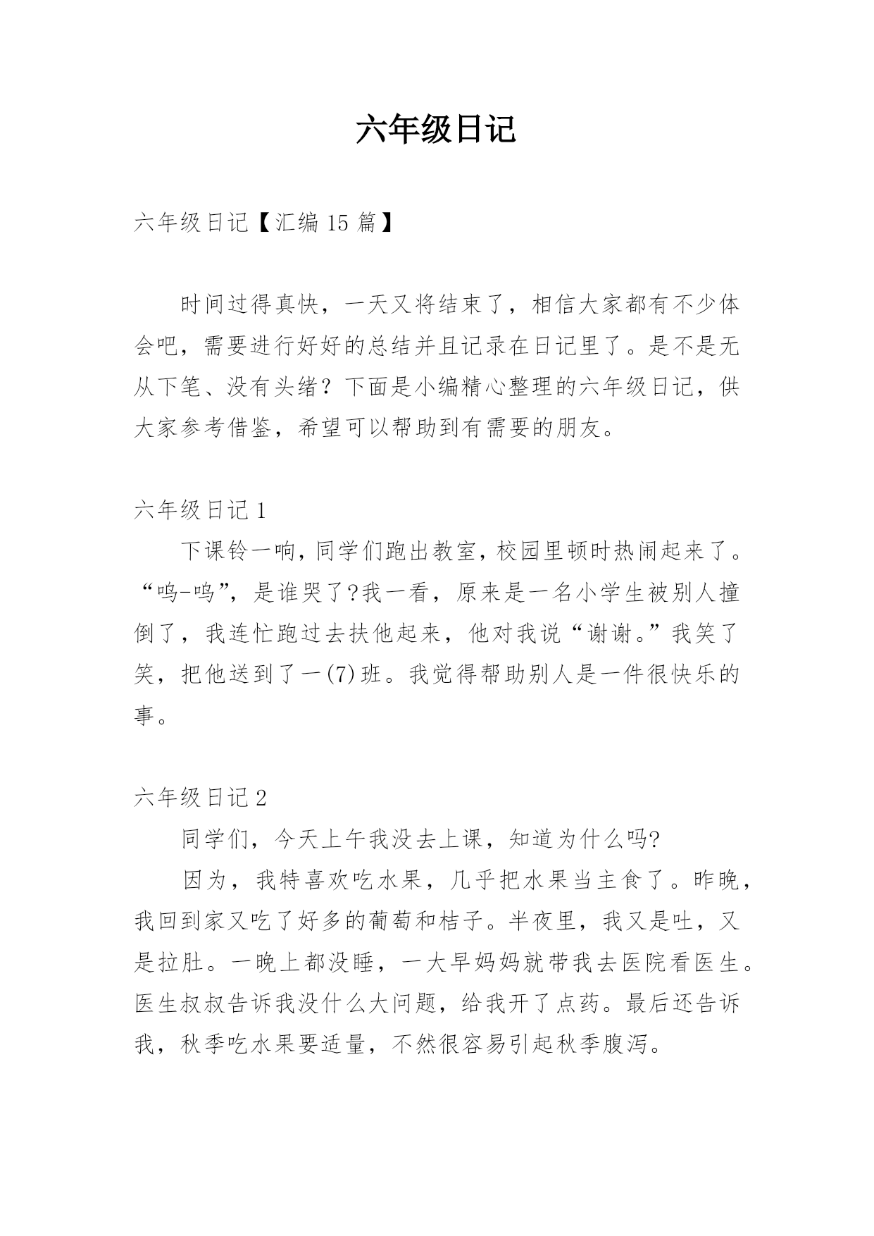 六年级日记六年级日记【汇编15篇】时间过得真快,一天又将结束了,相信大家都有不少体会吧,需要进行好好的总结并且记录在日记里了。是不是无从下笔、没有头绪?下面是小编精心整理的六年级日记,供大家参考借鉴,希望可以帮助到有需要的朋友。六年级日记1下课铃一响,同学们跑出教室,校园里顿时热闹起来了。“呜-呜”,是谁哭了?我一看,原来是一名小学生被别人撞倒了,我连忙跑过去扶他起来,他对我说“谢谢。”我笑了笑,把他送到了一(7)班。我觉得帮助别人是一件很快乐的事。六年级日记2同学们,今天上午我没去上课,知道为什么吗?因