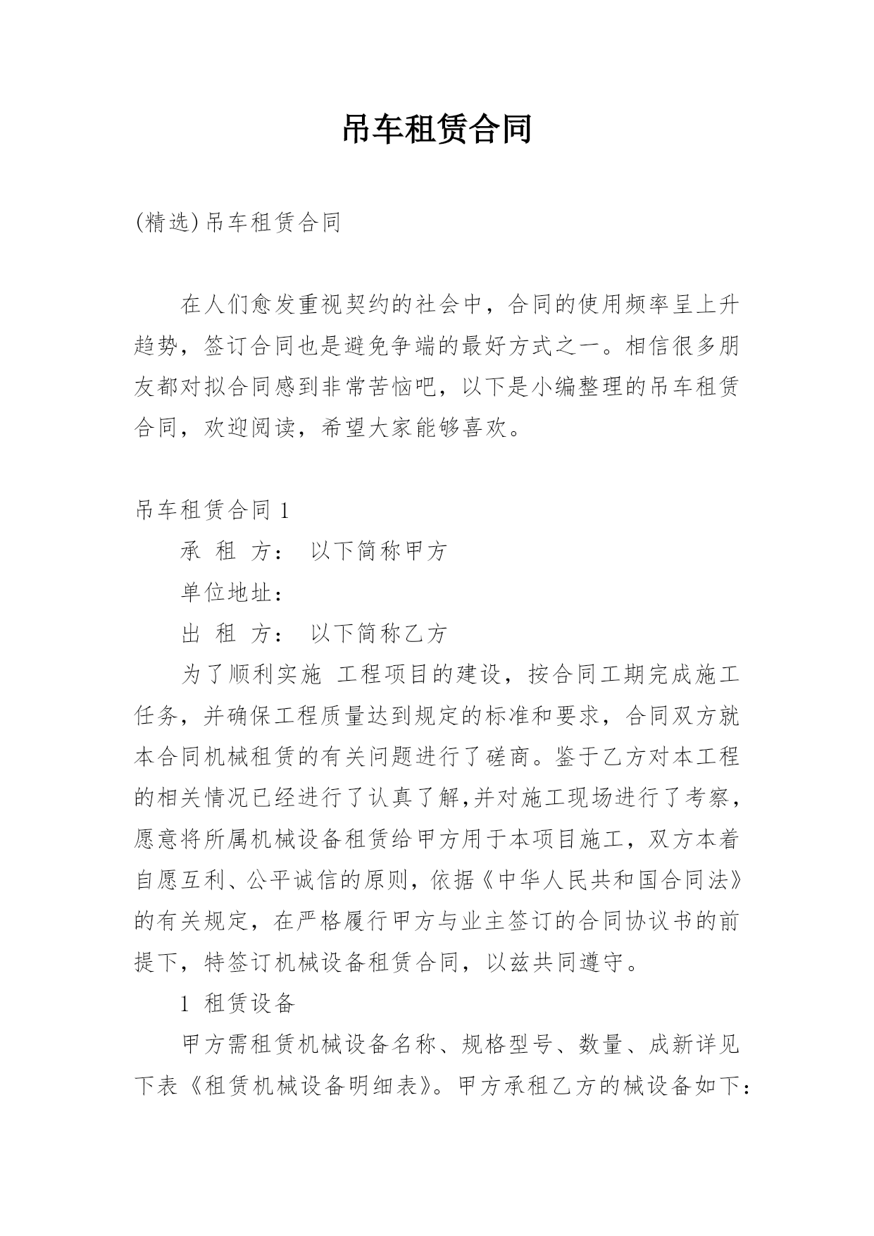 吊车租赁合同吊车租赁合同随着法律知识的普及,关于合同的利益纠纷越来越多,它也是减少和防止发生争议的重要措施。知道吗,写合同可是有方法的哦,以下是小编为大家整理的吊车租赁合同,仅供参考,大家一起来看看吧。吊车租赁合同1合同编号:承租方:(以下简称甲方)出租方:(以下简称乙方)根据《中华人民共和国合同法》及相关法规的有关规定,双方经过友好协商,本着平等互利,协商一致的原则,订立本合同。一、工程名称:__________二、工程地点:__________1、吊车主要用于甲方施工地点的吊装工作。2、租赁期内的吊车