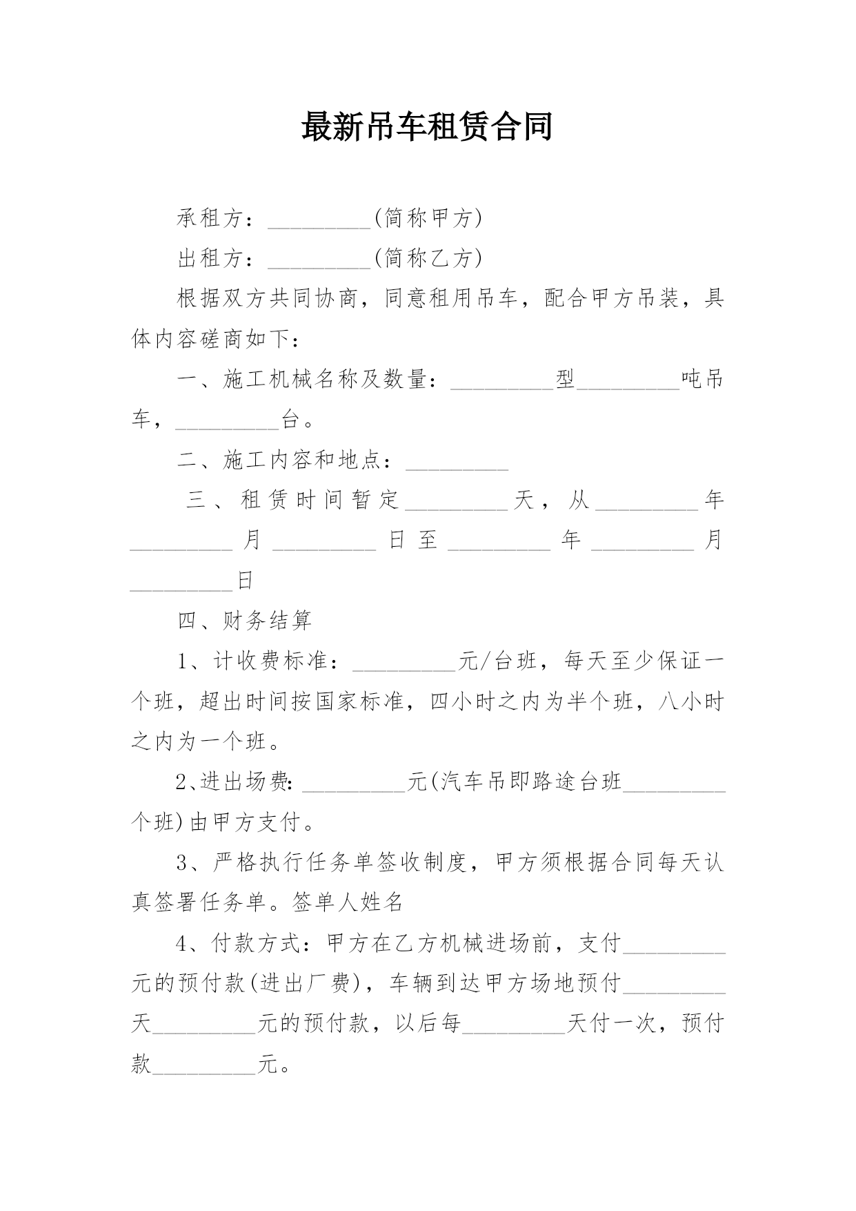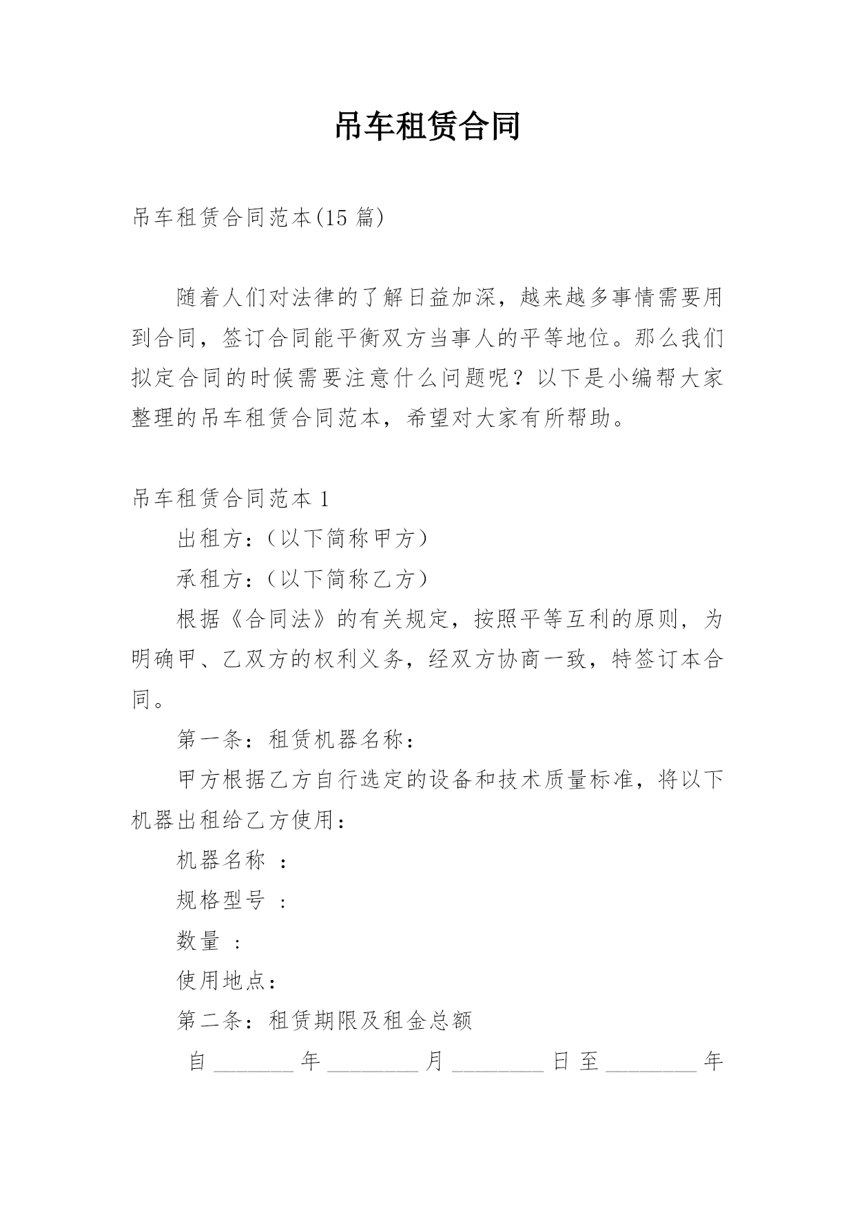 吊车租赁合同吊车租赁合同范本在不断进步的社会中,很多场合都离不了合同,它也是减少和防止发生争议的重要措施。那么相关的合同到底怎么写呢?下面是小编精心整理的吊车租赁合同范本,仅供参考,希望能够帮助到大家。吊车租赁合同范本1承租方(甲方):_________出租方(乙方):_________兹有甲方因施工需要租用乙方吊车,为明确责任和义务,经双方友好协商,特立本合同,共同遵守执行。一、吊车类型及数量:_________;施工地点:_________;施工内容:_________;使用时间:_________年