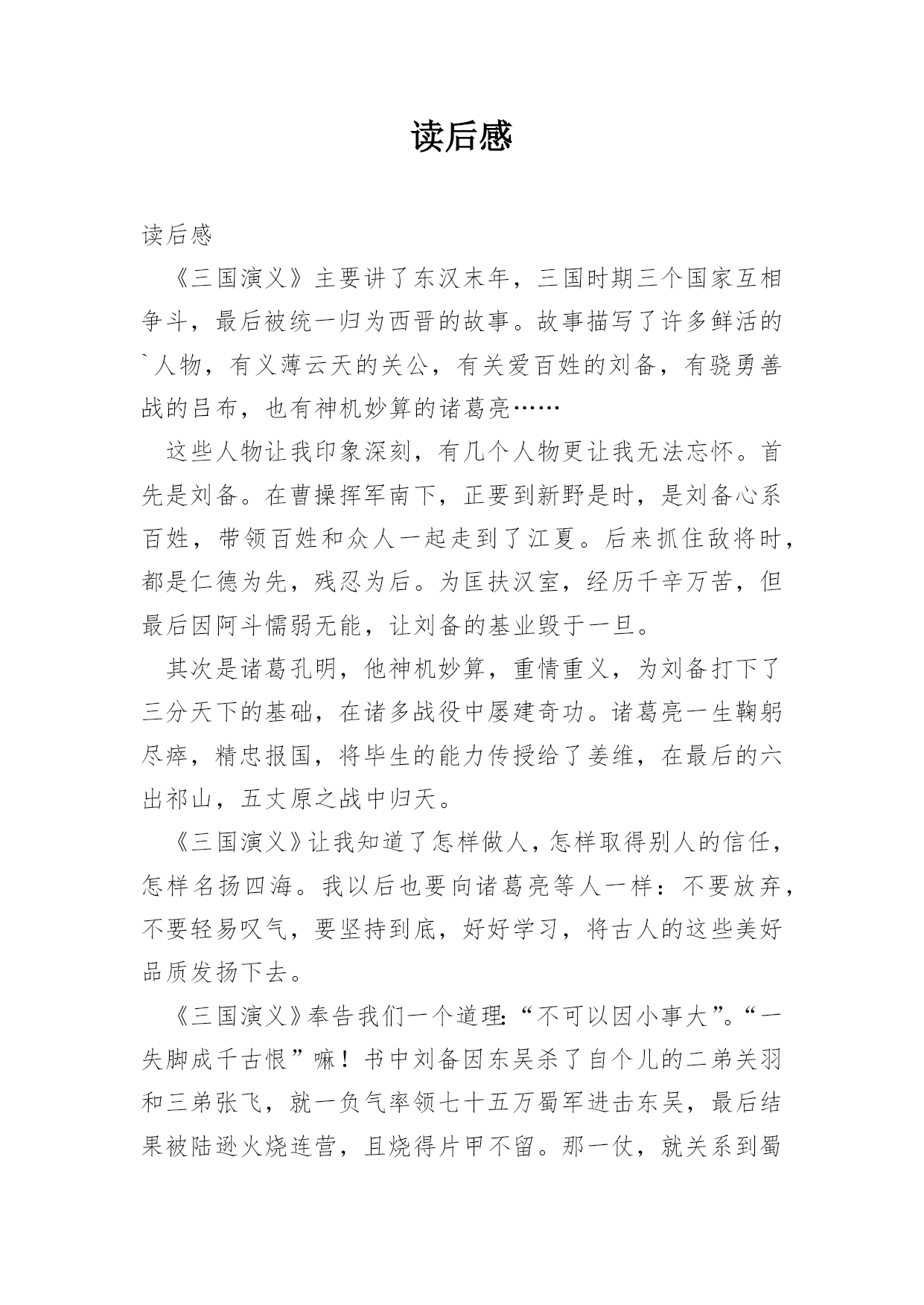 读后感读后感《三国演义》主要讲了东汉末年,三国时期三个国家互相争斗,最后被统一归为西晋的故事。故事描写了许多鲜活的`人物,有义薄云天的关公,有关爱百姓的刘备,有骁勇善战的吕布,也有神机妙算的诸葛亮……这些人物让我印象深刻,有几个人物更让我无法忘怀。首先是刘备。在曹操挥军南下,正要到新野是时,是刘备心系百姓,带领百姓和众人一起走到了江夏。后来抓住敌将时,都是仁德为先,残忍为后。为匡扶汉室,经历千辛万苦,但最后因阿斗懦弱无能,让刘备的基业毁于一旦。其次是诸葛孔明,他神机妙算,重情重义,为刘备打下了三分天下的基