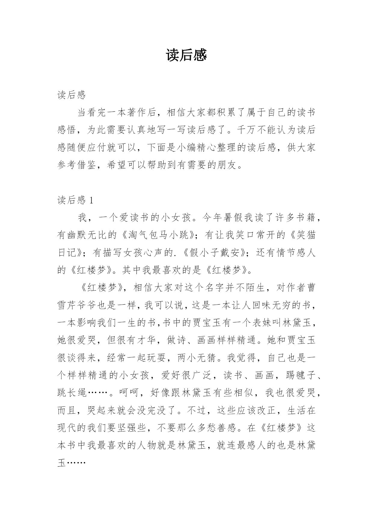 读后感读后感当看完一本著作后,相信大家都积累了属于自己的读书感悟,为此需要认真地写一写读后感了。千万不能认为读后感随便应付就可以,下面是小编精心整理的读后感,供大家参考借鉴,希望可以帮助到有需要的朋友。读后感1我,一个爱读书的小女孩。今年暑假我读了许多书籍,有幽默无比的《淘气包马小跳》;有让我笑口常开的《笑猫日记》;有描写女孩心声的.《假小子戴安》;还有情节感人的《红楼梦》。其中我最喜欢的是《红楼梦》。《红楼梦》,相信大家对这个名字并不陌生,对作者曹雪芹爷爷也是一样,我可以说,这是一本让人回味无穷的书,一