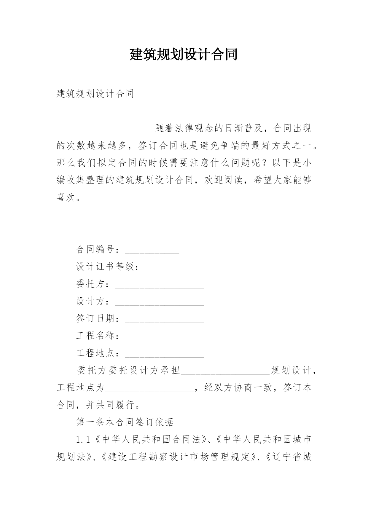 建筑规划设计合同建筑规划设计合同随着法律观念的日渐普及,合同出现的次数越来越多,签订合同也是避免争端的最好方式之一。那么我们拟定合同的时候需要注意什么问题呢?以下是小编收集整理的建筑规划设计合同,欢迎阅读,希望大家能够喜欢。合同编号:___________设计证书等级:____________委托方:__________________设计方:__________________签订日期:________________工程名称:________________工程地点:________________委