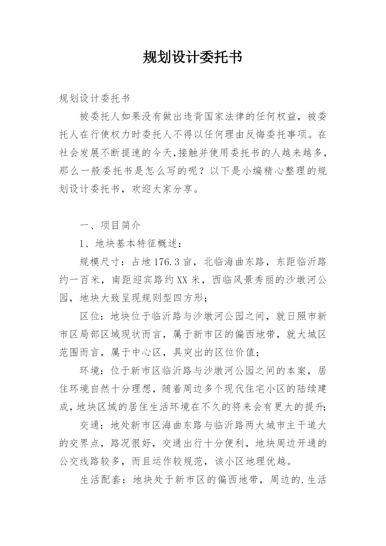 规划设计委托书规划设计委托书被委托人如果没有做出违背国家法律的任何权益,被委托人在行使权力时委托人不得以任何理由反悔委托事项。在社会发展不断提速的今天,接触并使用委托书的人越来越多,那么一般委托书是怎么写的呢?以下是小编精心整理的规划设计委托书,欢迎大家分享。一、项目简介1、地块基本特征概述:规模尺寸:占地176.3亩,北临海曲东路,东距临沂路约一百米,南距迎宾路约XX米,西临风景秀丽的沙墩河公园,地块大致呈现规则型四方形;区位:地块位于临沂路与沙墩河公园之间,就日照市新市区局部区域现状而言,属于新市区的