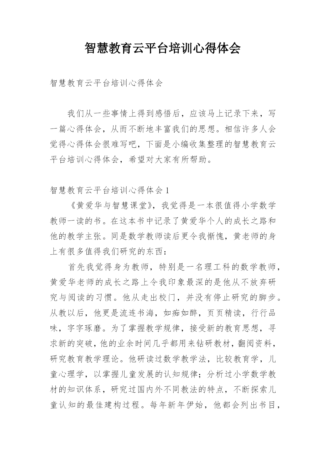 智慧教育云平台培训心得体会智慧教育云平台培训心得体会我们从一些事情上得到感悟后,应该马上记录下来,写一篇心得体会,从而不断地丰富我们的思想。相信许多人会觉得心得体会很难写吧,下面是小编收集整理的智慧教育云平台培训心得体会,希望对大家有所帮助。智慧教育云平台培训心得体会1《黄爱华与智慧课堂》,我觉得是一本很值得小学数学教师一读的书。在这本书中记录了黄爱华个人的成长之路和他的教学主张。同是数学教师读后更令我惭愧,黄老师的身上有很多值得我们研究的东西:首先我觉得身为教师,特别是一名理工科的数学教师,黄爱华老师的