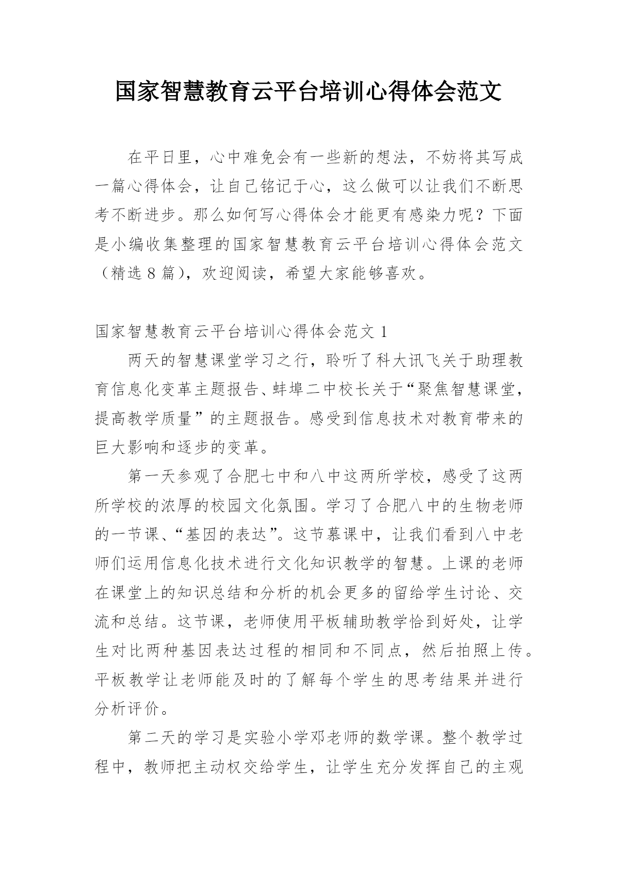 国家智慧教育云平台培训心得体会范文在平日里,心中难免会有一些新的想法,不妨将其写成一篇心得体会,让自己铭记于心,这么做可以让我们不断思考不断进步。那么如何写心得体会才能更有感染力呢?下面是小编收集整理的国家智慧教育云平台培训心得体会范文(精选8篇),欢迎阅读,希望大家能够喜欢。国家智慧教育云平台培训心得体会范文1两天的智慧课堂学习之行,聆听了科大讯飞关于助理教育信息化变革主题报告、蚌埠二中校长关于“聚焦智慧课堂,提高教学质量”的主题报告。感受到信息技术对教育带来的巨大影响和逐步的变革。第一天参观了合肥七中