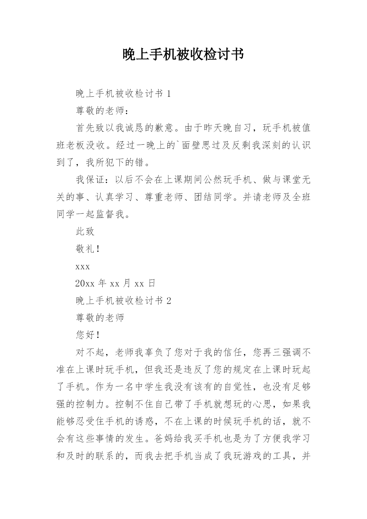 晚上手机被收检讨书晚上手机被收检讨书在学习、工作或生活中出现了问题或过错后,为了避免再犯,我们要通过写检讨书来反省,写检讨书尽量要写得深刻诚恳一些。但是你知道怎样才能写的好吗?以下是小编整理的晚上手机被收检讨书,仅供参考,大家一起来看看吧。晚上手机被收检讨书1尊敬的老师:首先致以我诚恳的歉意。由于昨天晚自习,玩手机被值班老板没收。经过一晚上的`面壁思过及反剩我深刻的认识到了,我所犯下的错。我保证:以后不会在上课期间公然玩手机、做与课堂无关的事、认真学习、尊重老师、团结同学。并请老师及全班同学一起监督我。此