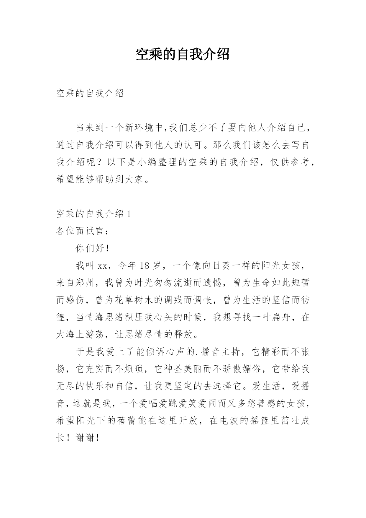 空乘自我介绍空乘自我介绍【热】当去到一个新环境下,我们通常会被要求作自我介绍,用自我介绍往往可以让他人有一定的了解。相信许多人会觉得自我介绍很难写吧,下面是小编帮大家整理的空乘自我介绍,希望对大家有所帮助。空乘自我介绍1尊敬的各位领导、各位老师:你们好!很荣幸能得到XX公司的这次面试机会。首先,请容我简单地做个自我介绍。我叫XXX,今年20岁,来自XX省XXX。我就读于XX大学XX专业,在校期间,我认真学习各门课程,积极参加各种文体活动。在性格比较外向,爱好广泛,与同学相处很融洽。课余时间我比较喜欢做一些