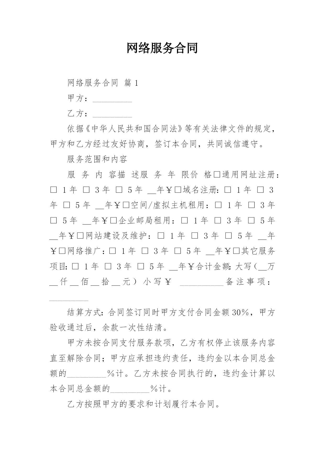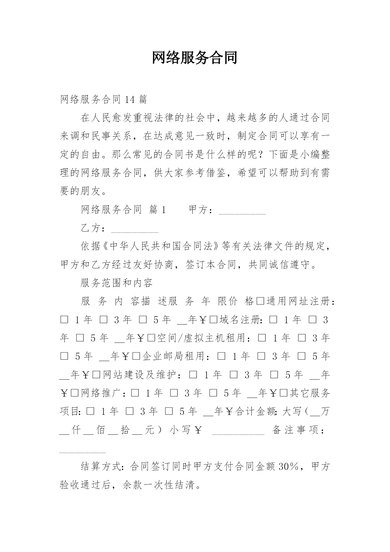 网络服务合同网络服务合同15篇在人们越来越相信法律的社会中,越来越多事情需要用到合同,签订合同可以明确双方当事人的权利和义务。相信很多朋友都对拟合同感到非常苦恼吧,以下是小编帮大家整理的网络服务合同,欢迎大家借鉴与参考,希望对大家有所帮助。网络服务合同1甲方:_________乙方:_________依据《中华人民共和国合同法》等有关法律文件的规定,甲方和乙方经过友好协商,签订本合同,共同诚信遵守。服务范围和内容:结算方式:合同签订同时甲方支付合同金额30%,甲方验收通过后,余款一次性结清。甲方未按合同支