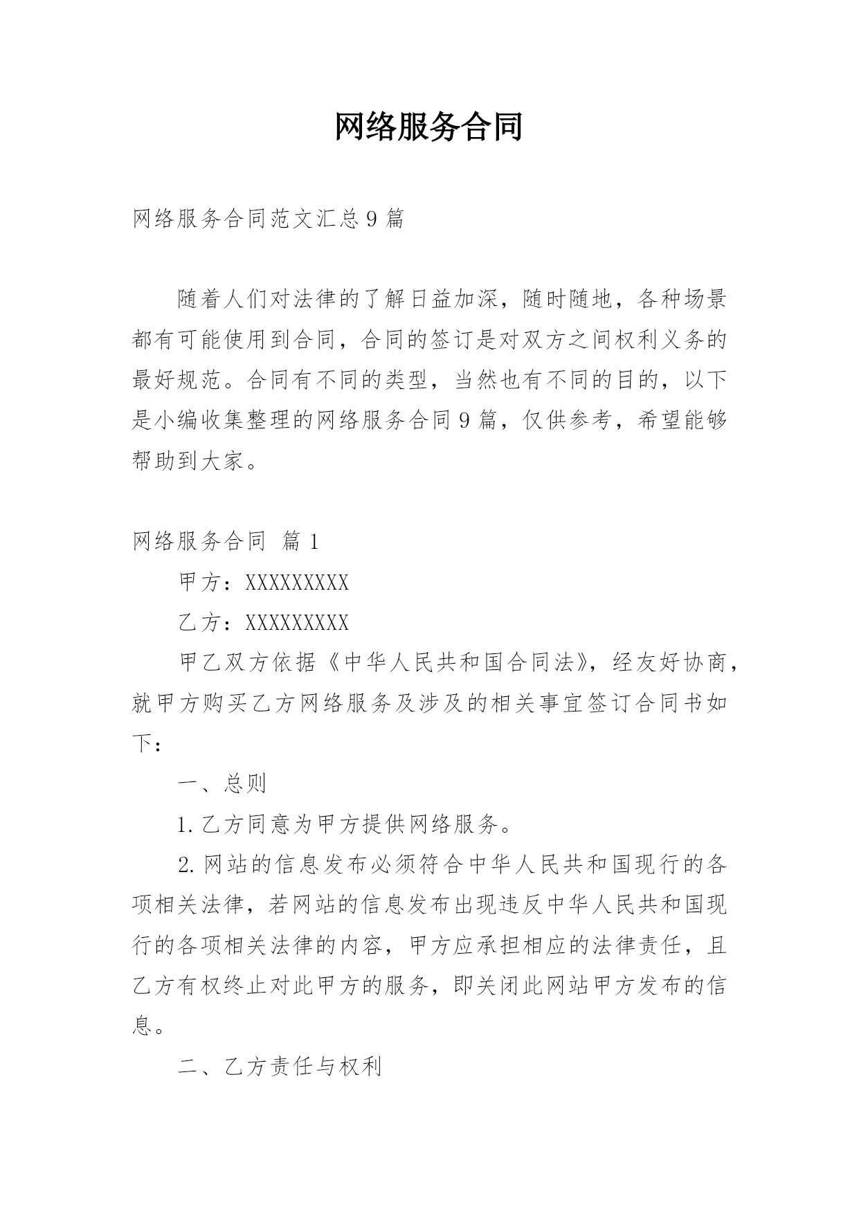 网络服务合同网络服务合同范文汇总9篇随着人们对法律的了解日益加深,随时随地,各种场景都有可能使用到合同,合同的签订是对双方之间权利义务的最好规范。合同有不同的类型,当然也有不同的目的,以下是小编收集整理的网络服务合同9篇,仅供参考,希望能够帮助到大家。网络服务合同篇1甲方:XXXXXXXXX乙方:XXXXXXXXX甲乙双方依据《中华人民共和国合同法》,经友好协商,就甲方购买乙方网络服务及涉及的相关事宜签订合同书如下:一、总则1.乙方同意为甲方提供网络服务。2.网站的信息发布必须符合中华人民共和国现行的各项