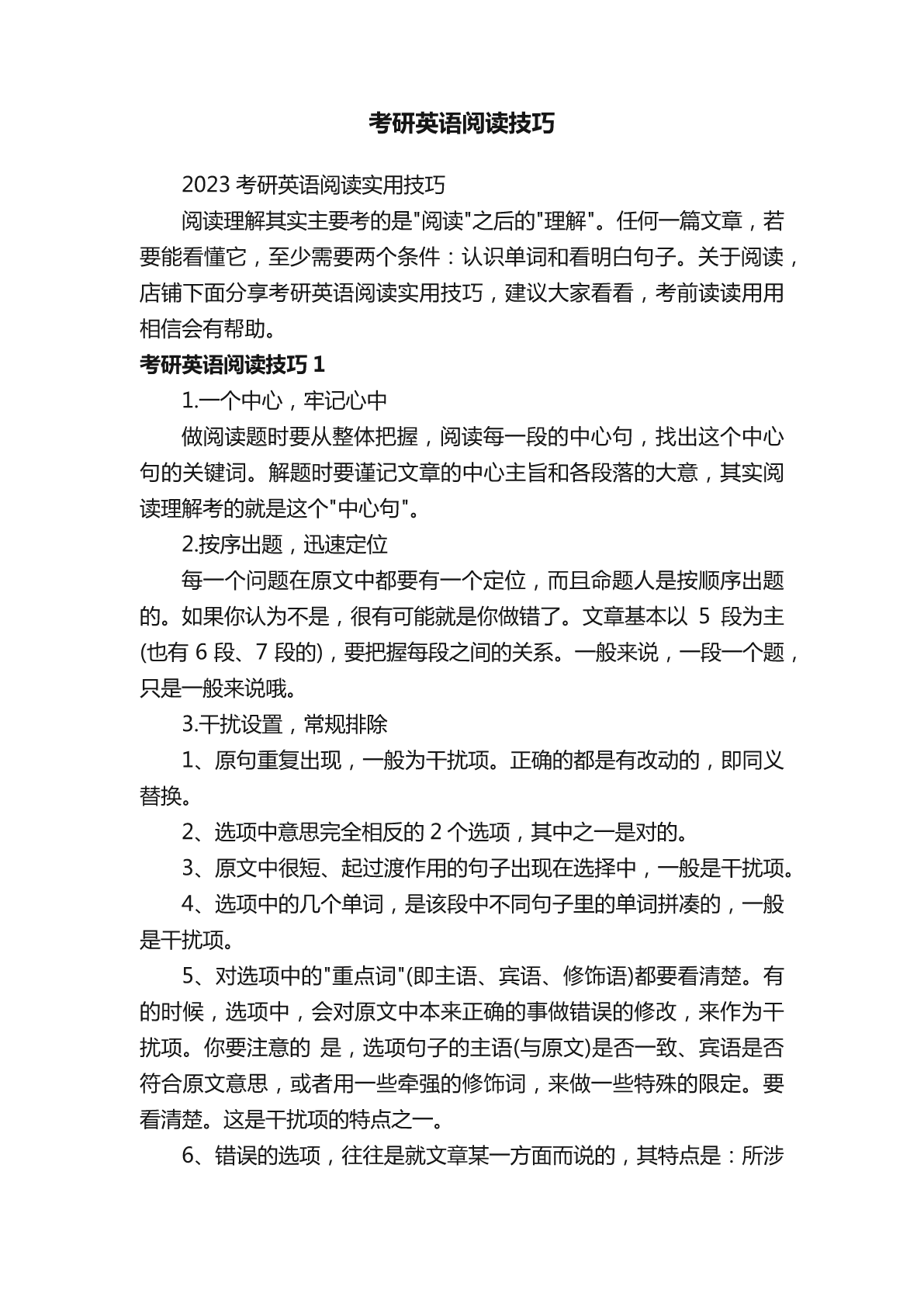 考研英语阅读技巧2023考研英语阅读实用技巧阅读理解其实主要考的是"阅读"之后的"理解"。任何一篇文章,若要能看懂它,至少需要两个条件:认识单词和看明白句子。关于阅读,店铺下面分享考研英语阅读实用技巧,建议大家看看,考前读读用用相信会有帮助。考研英语阅读技巧11.一个中心,牢记心中做阅读题时要从整体把握,阅读每一段的中心句,找出这个中心句的关键词。解题时要谨记文章的中心主旨和各段落的大意,其实阅读理解考的就是这个"中心句"。2.按序出题,迅速定位每一个问题在原文中都要有一个定位,而且命题人是按顺序出题的。