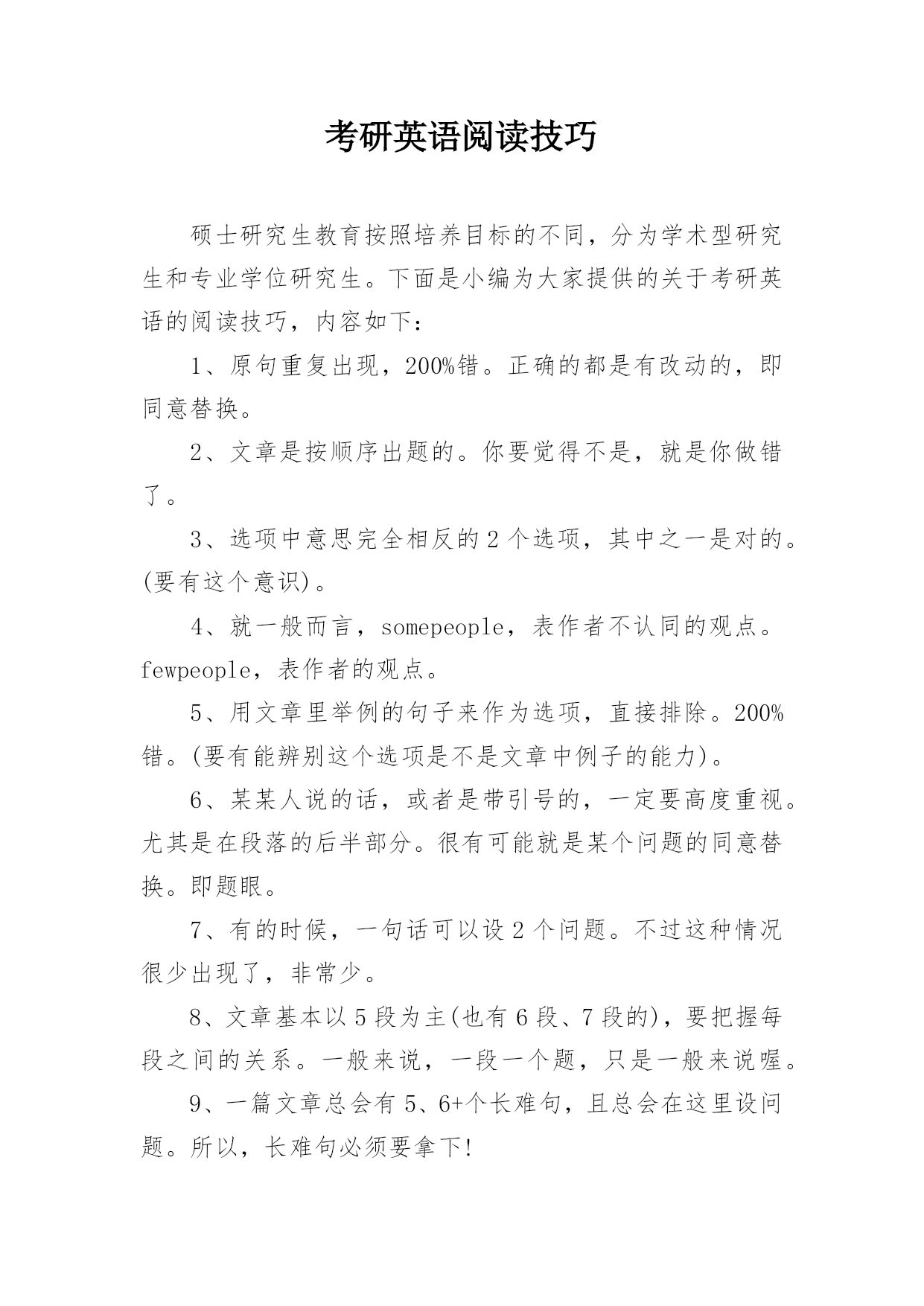 考研英语阅读技巧考研英语阅读技巧硕士研究生教育按照培养目标的不同,分为学术型研究生和专业学位研究生。下面是小编为大家提供的关于考研英语的阅读技巧,内容如下:1、原句重复出现,200%错。正确的都是有改动的,即同意替换。2、文章是按顺序出题的。你要觉得不是,就是你做错了。3、选项中意思完全相反的2个选项,其中之一是对的。(要有这个意识)。4、就一般而言,somepeople,表作者不认同的观点。fewpeople,表作者的观点。5、用文章里举例的句子来作为选项,直接排除。200%错。(要有能辨别这个选项是不