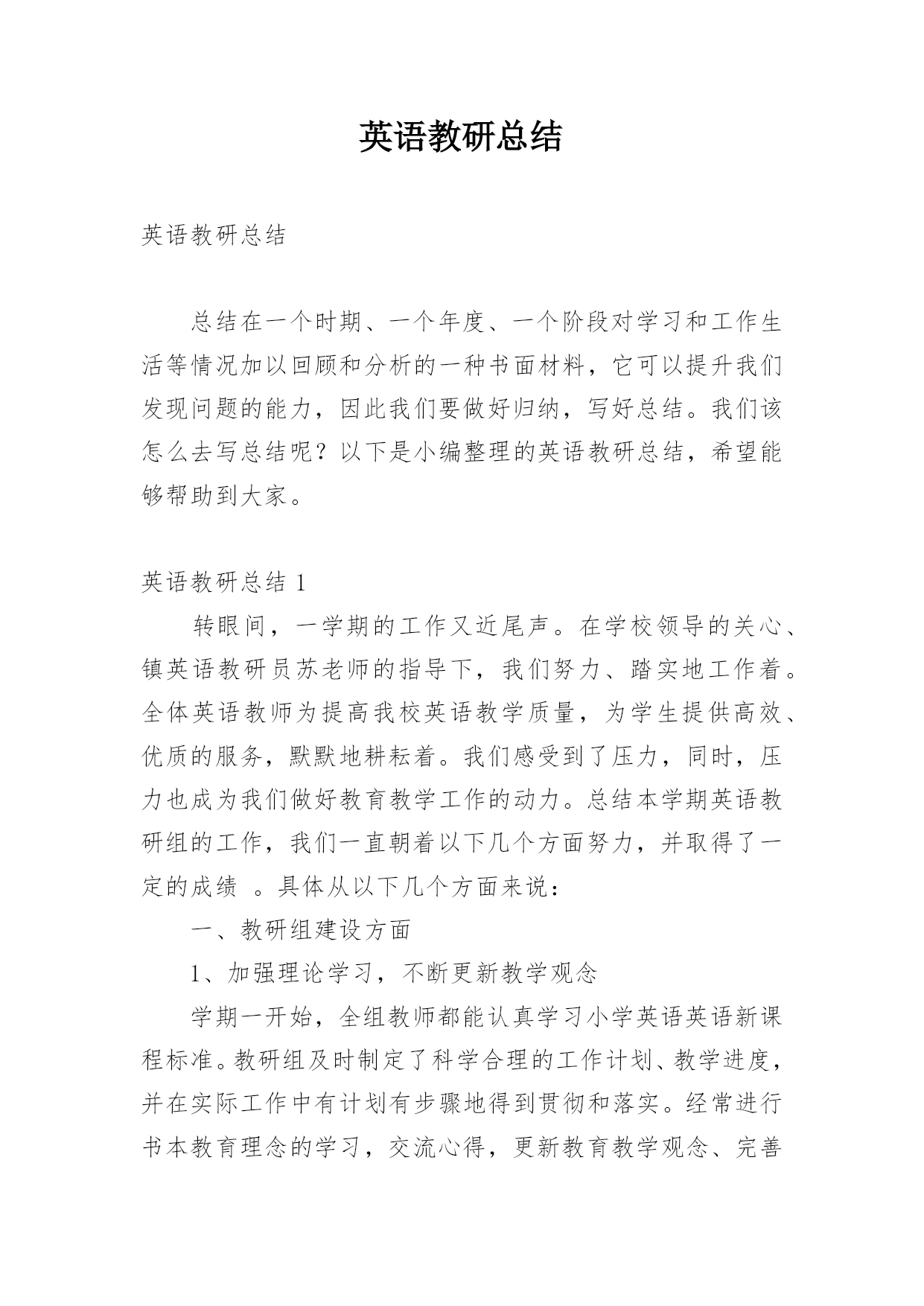 英语教研总结英语教研总结总结在一个时期、一个年度、一个阶段对学习和工作生活等情况加以回顾和分析的一种书面材料,它可以提升我们发现问题的能力,因此我们要做好归纳,写好总结。我们该怎么去写总结呢?以下是小编整理的英语教研总结,希望能够帮助到大家。英语教研总结1转眼间,一学期的工作又近尾声。在学校领导的关心、镇英语教研员苏老师的指导下,我们努力、踏实地工作着。全体英语教师为提高我校英语教学质量,为学生提供高效、优质的服务,默默地耕耘着。我们感受到了压力,同时,压力也成为我们做好教育教学工作的动力。总结本学期英语