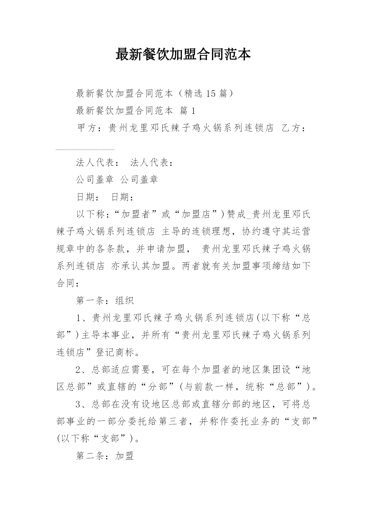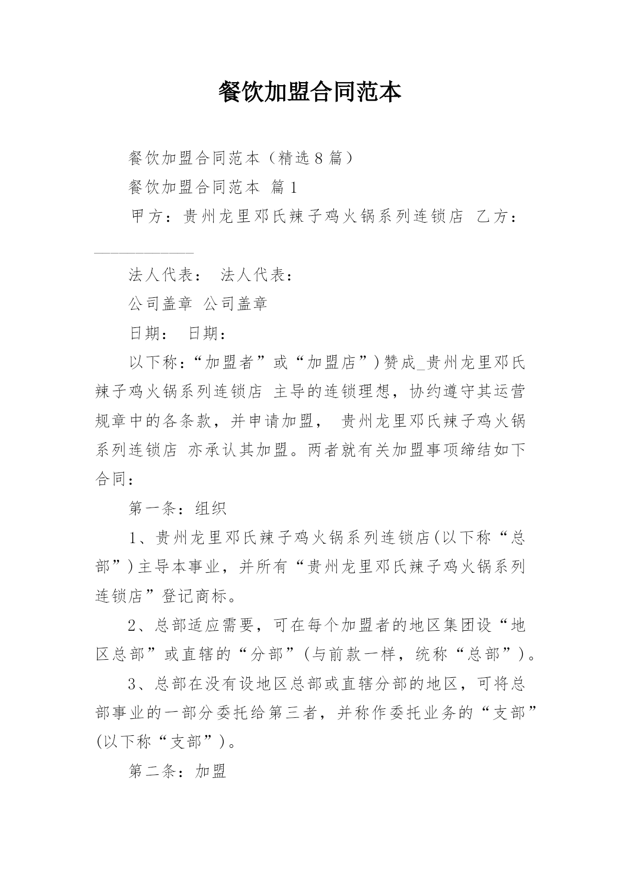 餐饮加盟合同范本餐饮加盟合同范本(精选8篇)餐饮加盟合同范本篇1甲方:贵州龙里邓氏辣子鸡火锅系列连锁店乙方:____________法人代表:法人代表:公司盖章公司盖章日期:日期:以下称:“加盟者”或“加盟店”)赞成_贵州龙里邓氏辣子鸡火锅系列连锁店主导的连锁理想,协约遵守其运营规章中的各条款,并申请加盟,贵州龙里邓氏辣子鸡火锅系列连锁店亦承认其加盟。两者就有关加盟事项缔结如下合同:第一条:组织1、贵州龙里邓氏辣子鸡火锅系列连锁店(以下称“总部”)主导本事业,并所有“贵州龙里邓氏辣子鸡火锅系列连锁店”登记