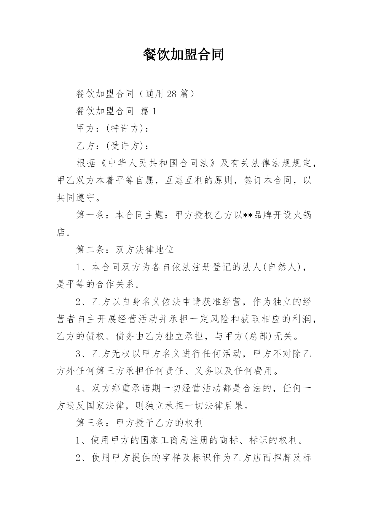餐饮加盟合同餐饮加盟合同(通用28篇)餐饮加盟合同篇1甲方:(特许方):乙方:(受许方):根据《中华人民共和国合同法》及有关法律法规规定,甲乙双方本着平等自愿,互惠互利的原则,签订本合同,以共同遵守。第一条:本合同主题:甲方授权乙方以**品牌开设火锅店。第二条:双方法律地位1、本合同双方为各自依法注册登记的法人(自然人),是平等的合作关系。2、乙方以自身名义依法申请获准经营,作为独立的经营者自主开展经营活动并承担一定风险和获取相应的利润,乙方的债权、债务由乙方独立承担,与甲方(总部)无关。3、乙方无权以甲