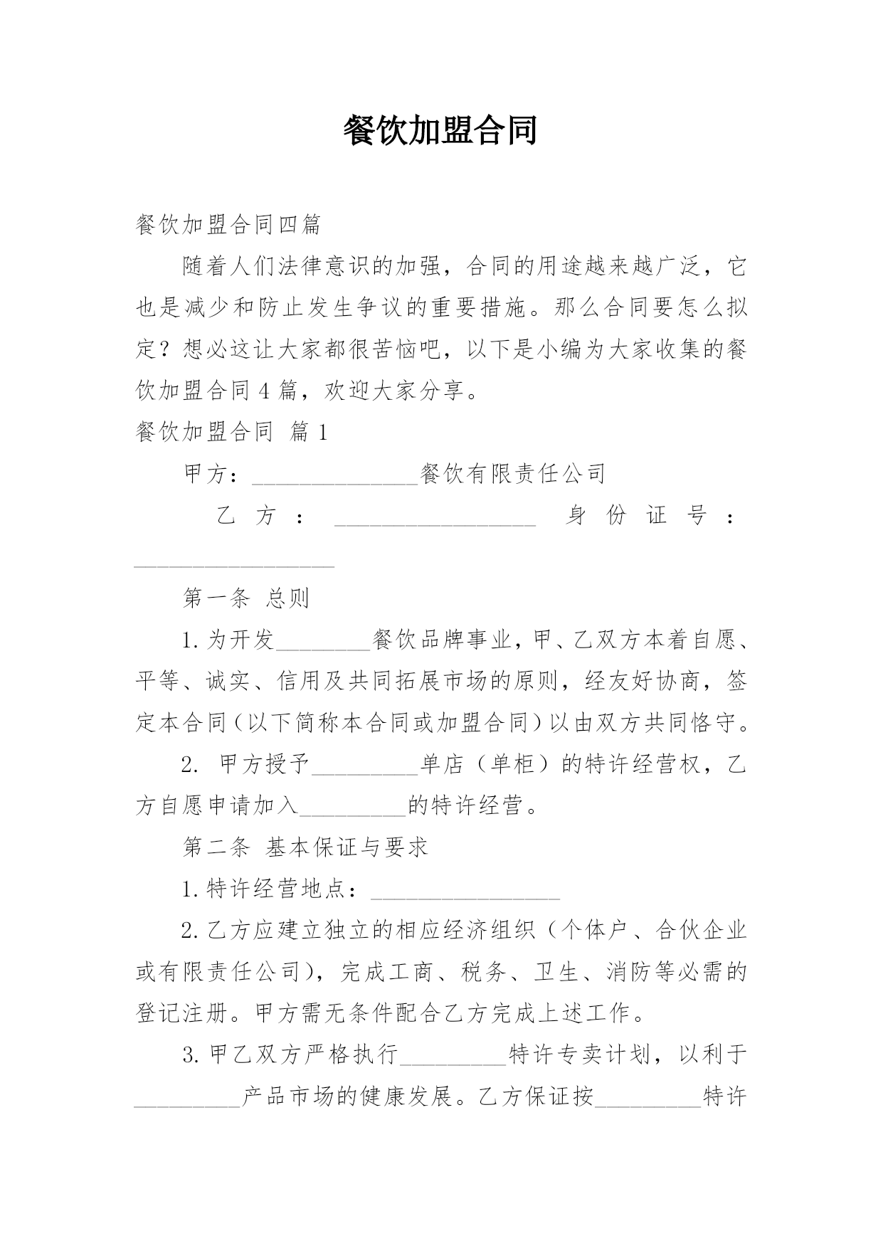 餐饮加盟合同餐饮加盟合同四篇随着人们法律意识的加强,合同的用途越来越广泛,它也是减少和防止发生争议的重要措施。那么合同要怎么拟定?想必这让大家都很苦恼吧,以下是小编为大家收集的餐饮加盟合同4篇,欢迎大家分享。餐饮加盟合同篇1甲方:______________餐饮有限责任公司乙方:_________________身份证号:_________________第一条总则1.为开发________餐饮品牌事业,甲、乙双方本着自愿、平等、诚实、信用及共同拓展市场的原则,经友好协商,签定本合同(以下简称本合同或加盟