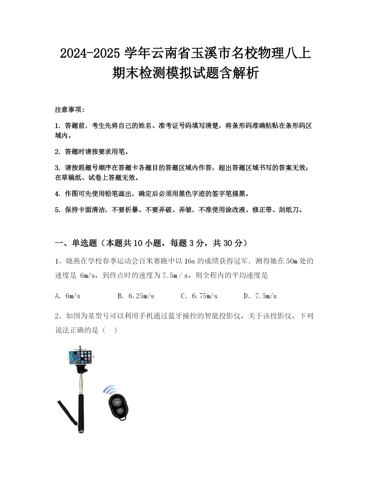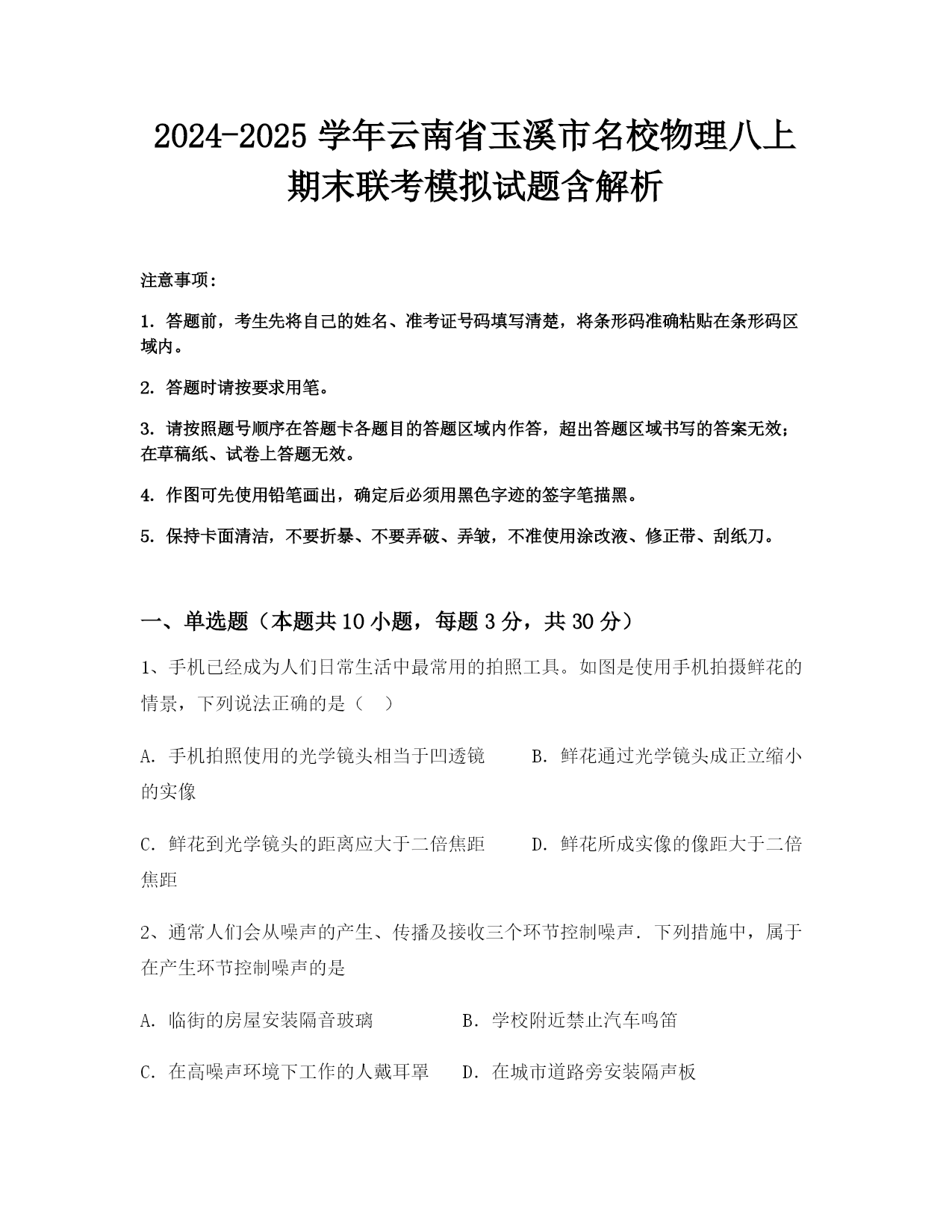 2024-2025学年云南省玉溪市名校物理八上期末联考模拟试题含解析注意事项:1.答题前,考生先将自己的姓名、准考证号码填写清楚,将条形码准确粘贴在条形码区域内。2.答题时请按要求用笔。3.请按照题号顺序在答题卡各题目的答题区域内作答,超出答题区域书写的答案无效;在草稿纸、试卷上答题无效。4.作图可先使用铅笔画出,确定后必须用黑色字迹的签字笔描黑。5.保持卡面清洁,不要折暴、不要弄破、弄皱,不准使用涂改液、修正带、刮纸刀。一、单选题(本题共10小题,每题3分,共30分)1、手机已经成为人们日常生活中最常用
