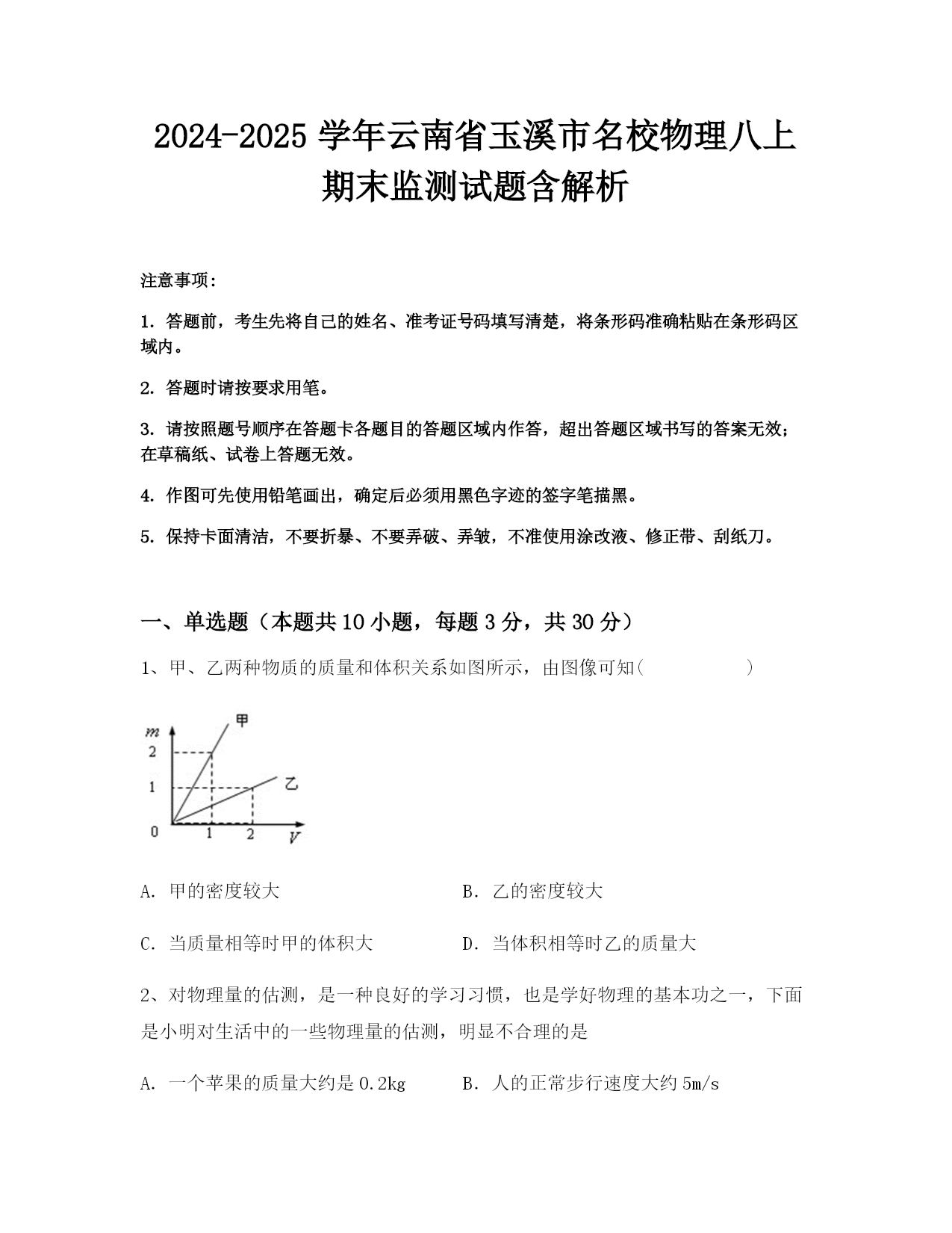 2024-2025学年云南省玉溪市名校物理八上期末监测试题含解析注意事项:1.答题前,考生先将自己的姓名、准考证号码填写清楚,将条形码准确粘贴在条形码区域内。2.答题时请按要求用笔。3.请按照题号顺序在答题卡各题目的答题区域内作答,超出答题区域书写的答案无效;在草稿纸、试卷上答题无效。4.作图可先使用铅笔画出,确定后必须用黑色字迹的签字笔描黑。5.保持卡面清洁,不要折暴、不要弄破、弄皱,不准使用涂改液、修正带、刮纸刀。一、单选题(本题共10小题,每题3分,共30分)1、甲、乙两种物质的质量和体积关系如图所