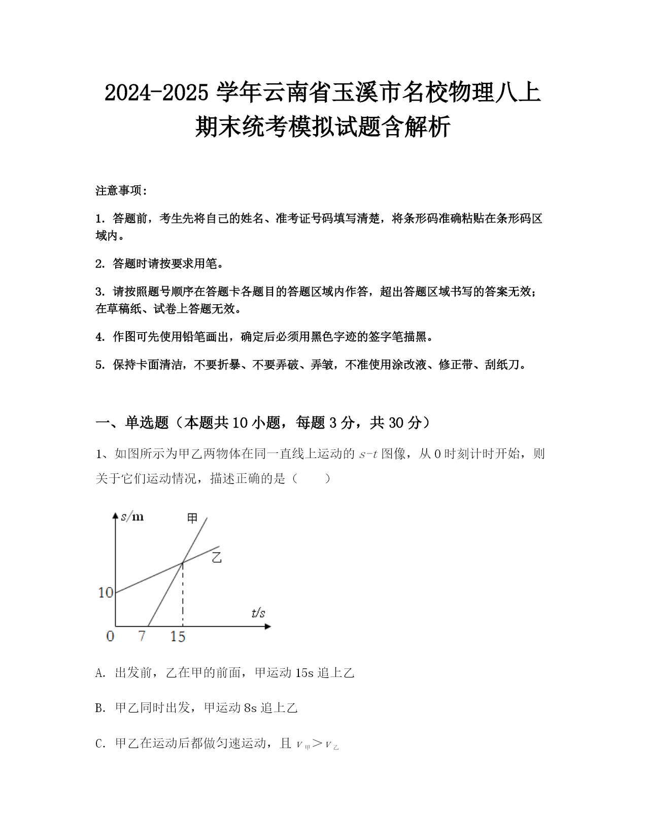 2024-2025学年云南省玉溪市名校物理八上期末统考模拟试题含解析注意事项:1.答题前,考生先将自己的姓名、准考证号码填写清楚,将条形码准确粘贴在条形码区域内。2.答题时请按要求用笔。3.请按照题号顺序在答题卡各题目的答题区域内作答,超出答题区域书写的答案无效;在草稿纸、试卷上答题无效。4.作图可先使用铅笔画出,确定后必须用黑色字迹的签字笔描黑。5.保持卡面清洁,不要折暴、不要弄破、弄皱,不准使用涂改液、修正带、刮纸刀。一、单选题(本题共10小题,每题3分,共30分)1、如图所示为甲乙两物体在同一直线上
