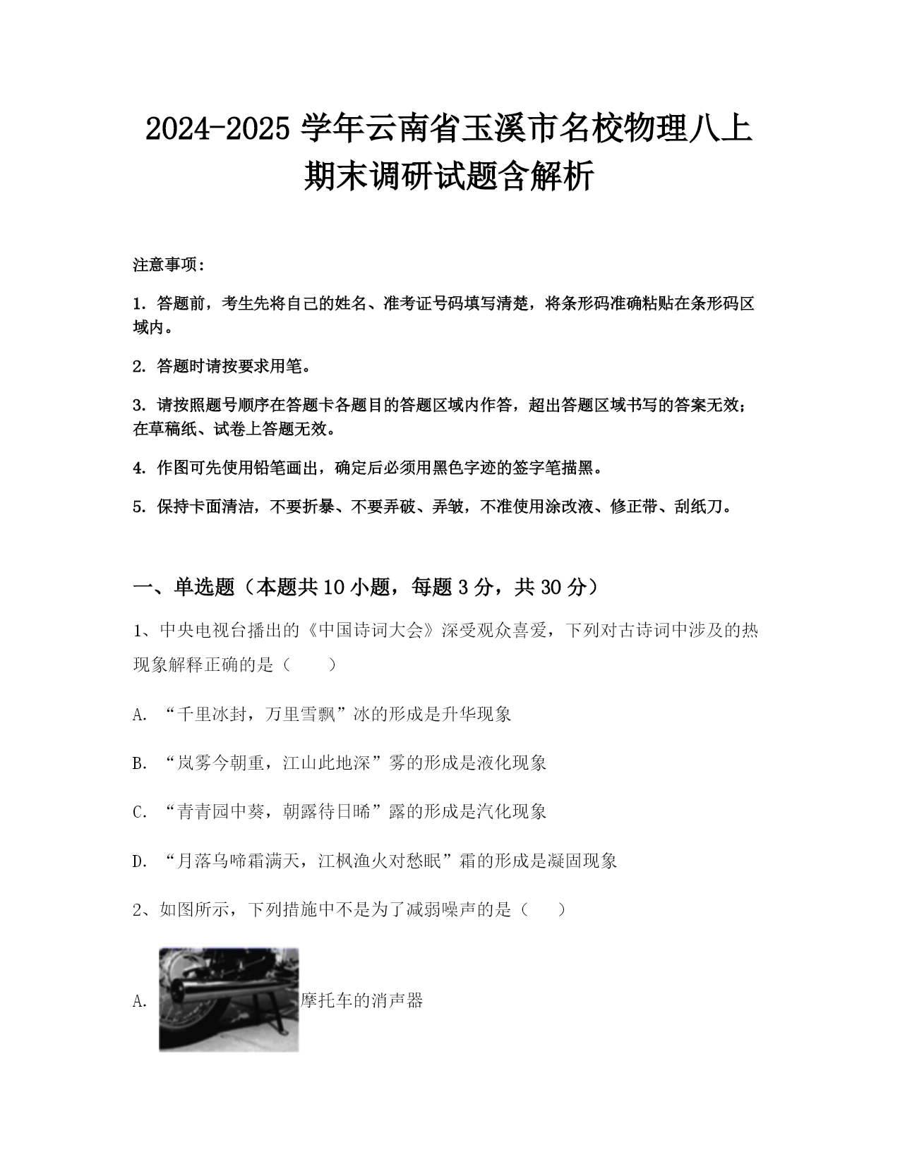 2024-2025学年云南省玉溪市名校物理八上期末调研试题含解析注意事项:1.答题前,考生先将自己的姓名、准考证号码填写清楚,将条形码准确粘贴在条形码区域内。2.答题时请按要求用笔。3.请按照题号顺序在答题卡各题目的答题区域内作答,超出答题区域书写的答案无效;在草稿纸、试卷上答题无效。4.作图可先使用铅笔画出,确定后必须用黑色字迹的签字笔描黑。5.保持卡面清洁,不要折暴、不要弄破、弄皱,不准使用涂改液、修正带、刮纸刀。一、单选题(本题共10小题,每题3分,共30分)1、中央电视台播出的《中国诗词大会》深受