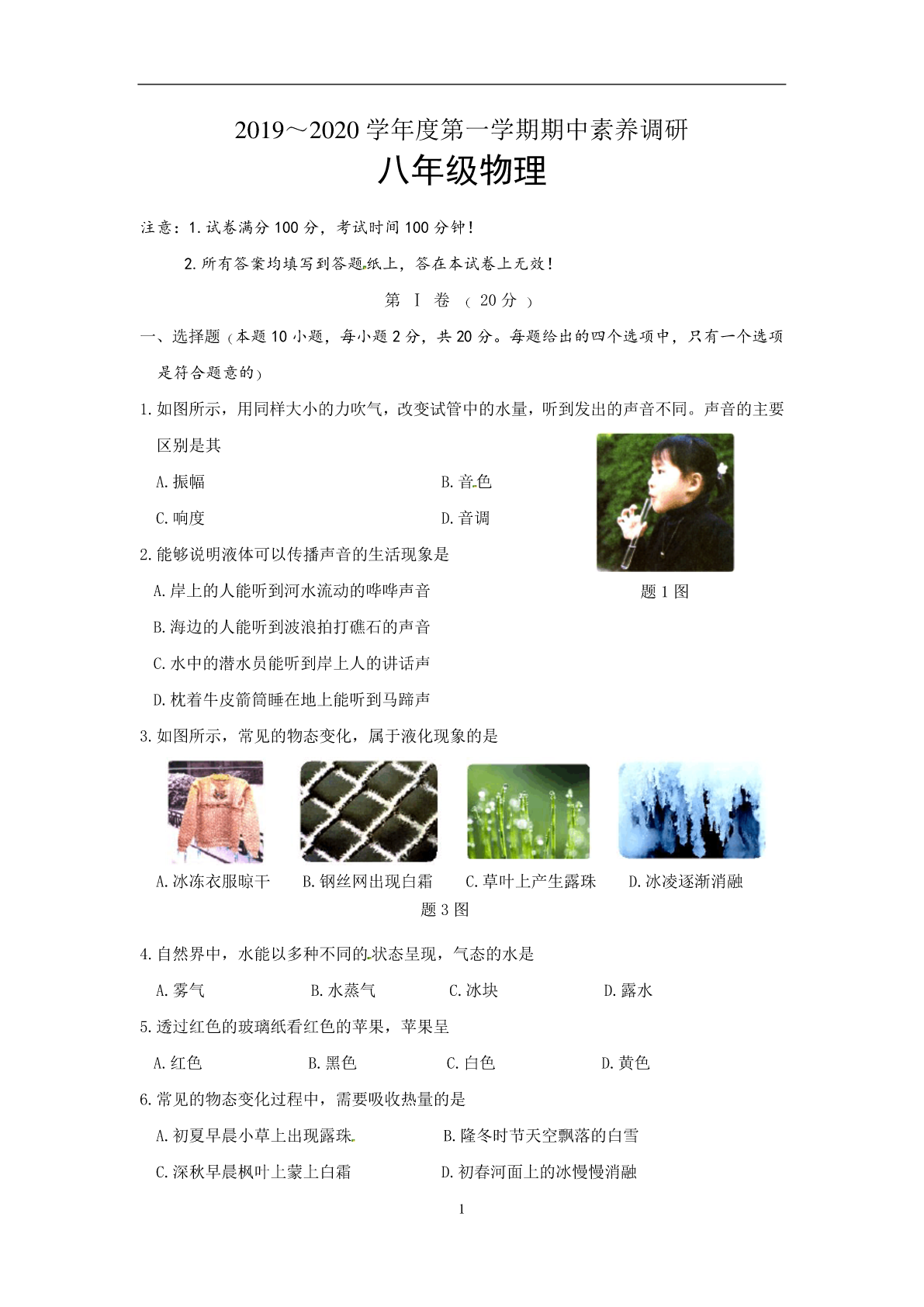 2019~2020学年度第一学期期中素养调研八年级物理注意:1.试卷满分100分,考试时间100分钟!2.所有答案均填写到答题纸上,答在本试卷上无效!第Ⅰ卷(20分)一、选择题(本题10小题,每小题2分,共20分。每题给出的四个选项中,只有一个选项是符合题意的)1.如图所示,用同样大小的力吹气,改变试管中的水量,听到发出的声音不同。声音的主要区别是其A.振幅B.音色C.响度D.音调2.能够说明液体可以传播声音的生活现象是A.岸上的人能听到河水流动的哗哗声音题1图B.海边的人能听到波浪拍打礁石的声音C.水中