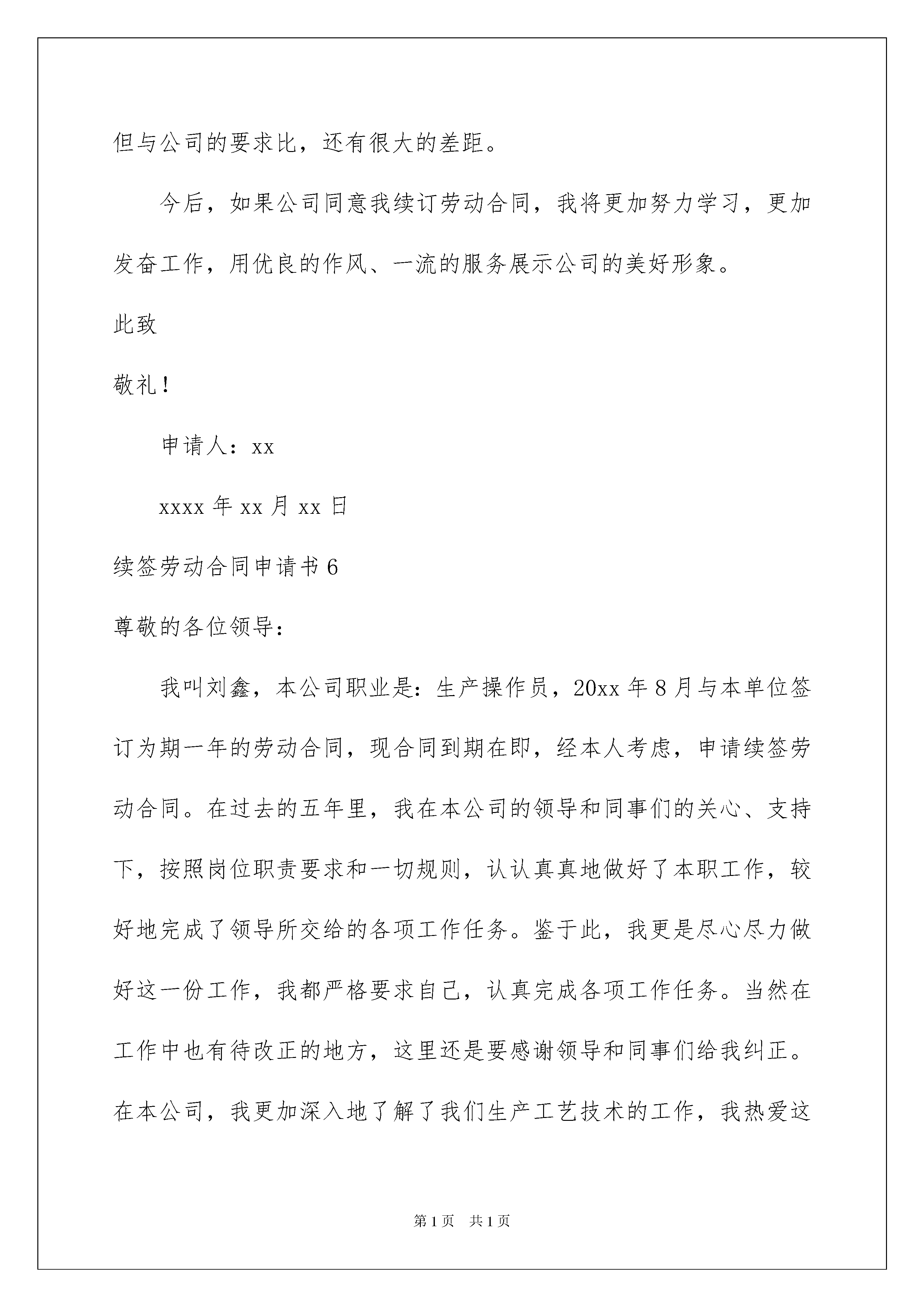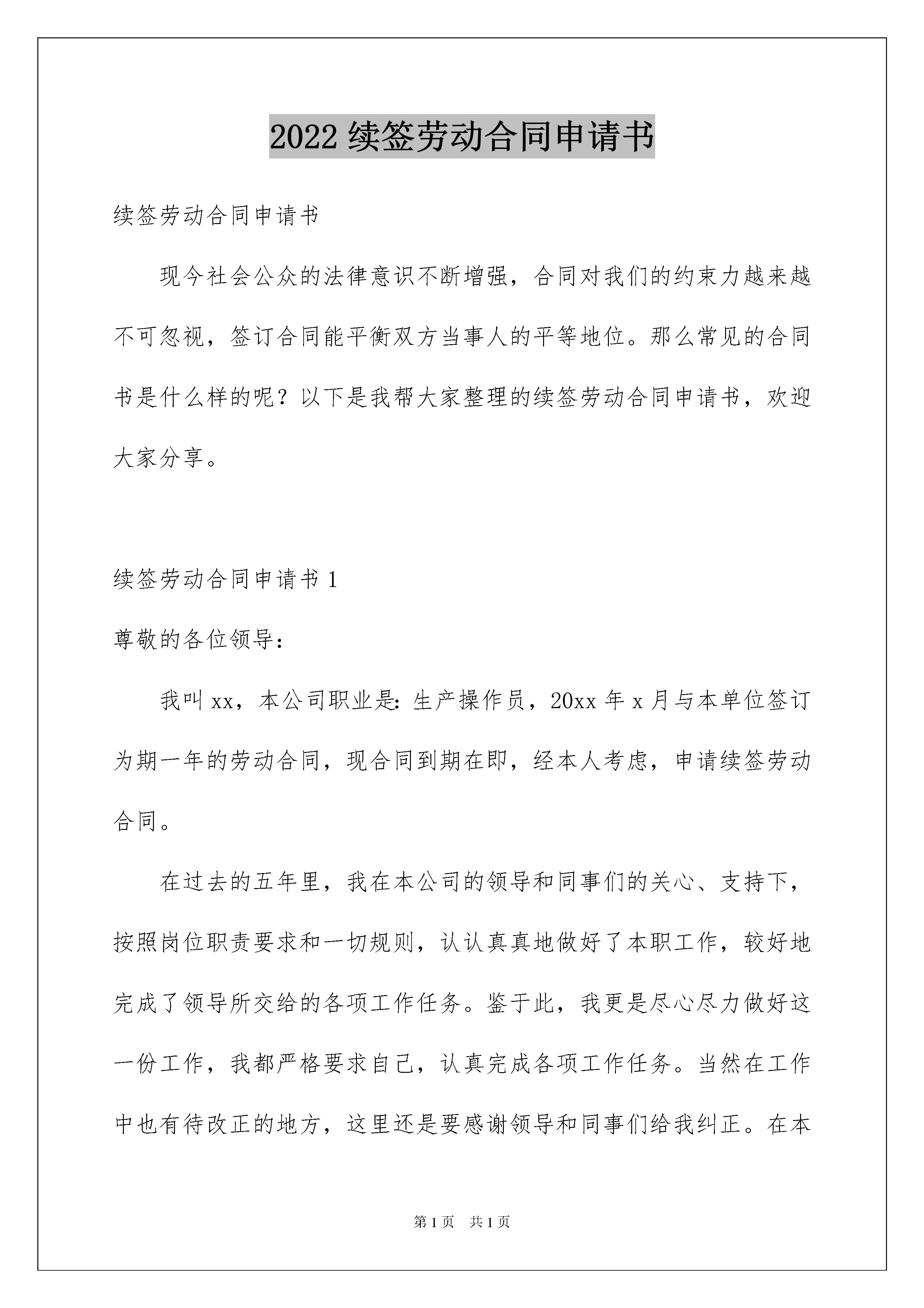 2022续签劳动合同申请书续签劳动合同申请书现今社会公众的法律意识不断增强,合同对我们的约束力越来越不可忽视,签订合同能平衡双方当事人的平等地位。那么常见的合同书是什么样的呢?以下是我帮大家整理的续签劳动合同申请书,欢迎大家分享。续签劳动合同申请书1尊敬的各位领导:我叫xx,本公司职业是:生产操作员,20xx年x月与本单位签订为期一年的劳动合同,现合