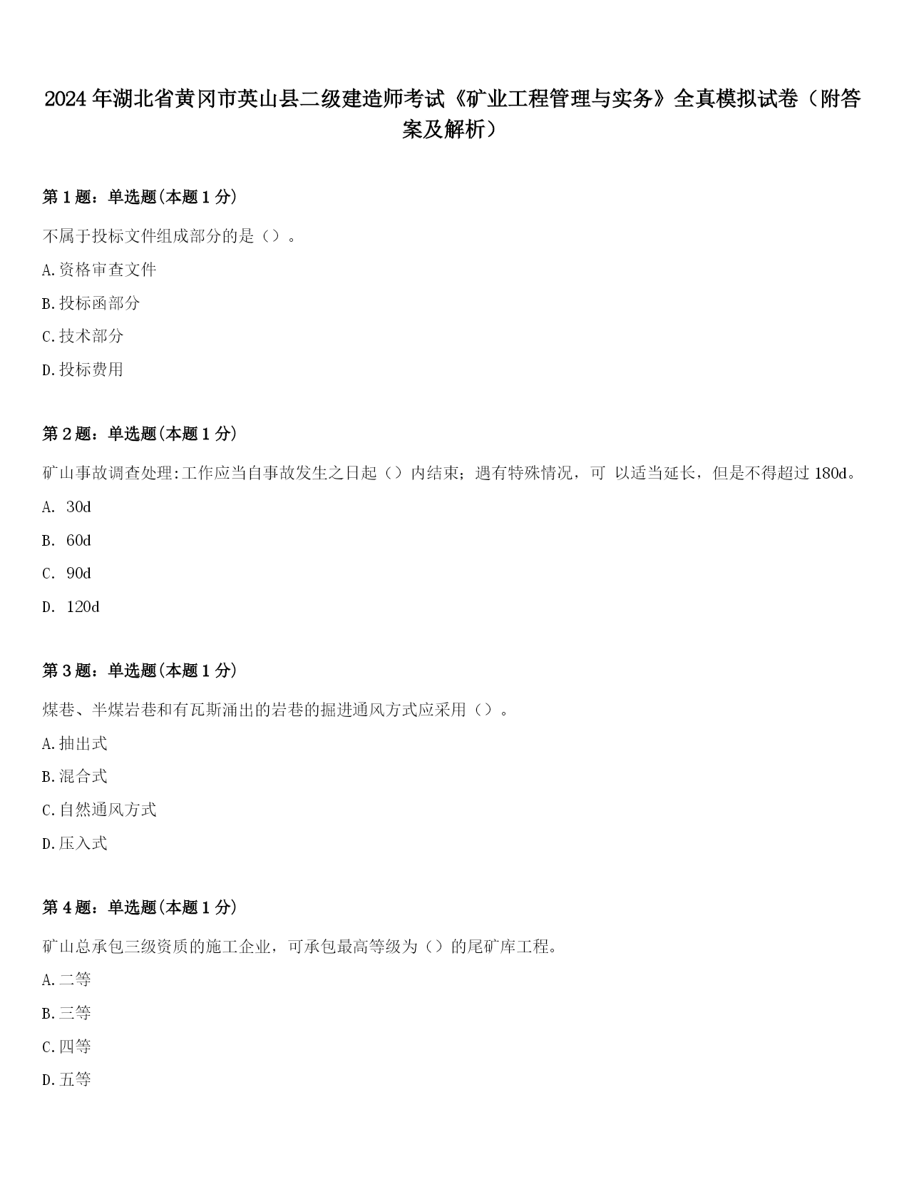 2024年湖北省黄冈市英山县二级建造师考试《矿业工程管理与实务》全真模拟试卷(附答案及解析)第1题:单选题(本题1分)不属于投标文件组成部分的是()。A.资格审查文件B.投标函部分C.技术部分D.投标费用第2题:单选题(本题1分)矿山事故调查处理:工作应当自事故发生之日起()内结束;遇有特殊情况,可以适当延长,但是不得超过180d。A.30dB.60dC.90dD.120d第3题:单选题(本题1分)煤巷、半煤岩巷和有瓦斯涌出的岩巷的掘进通风方式应采用()。A.抽出式B.混合式C.自然通风方式D.压入式第4