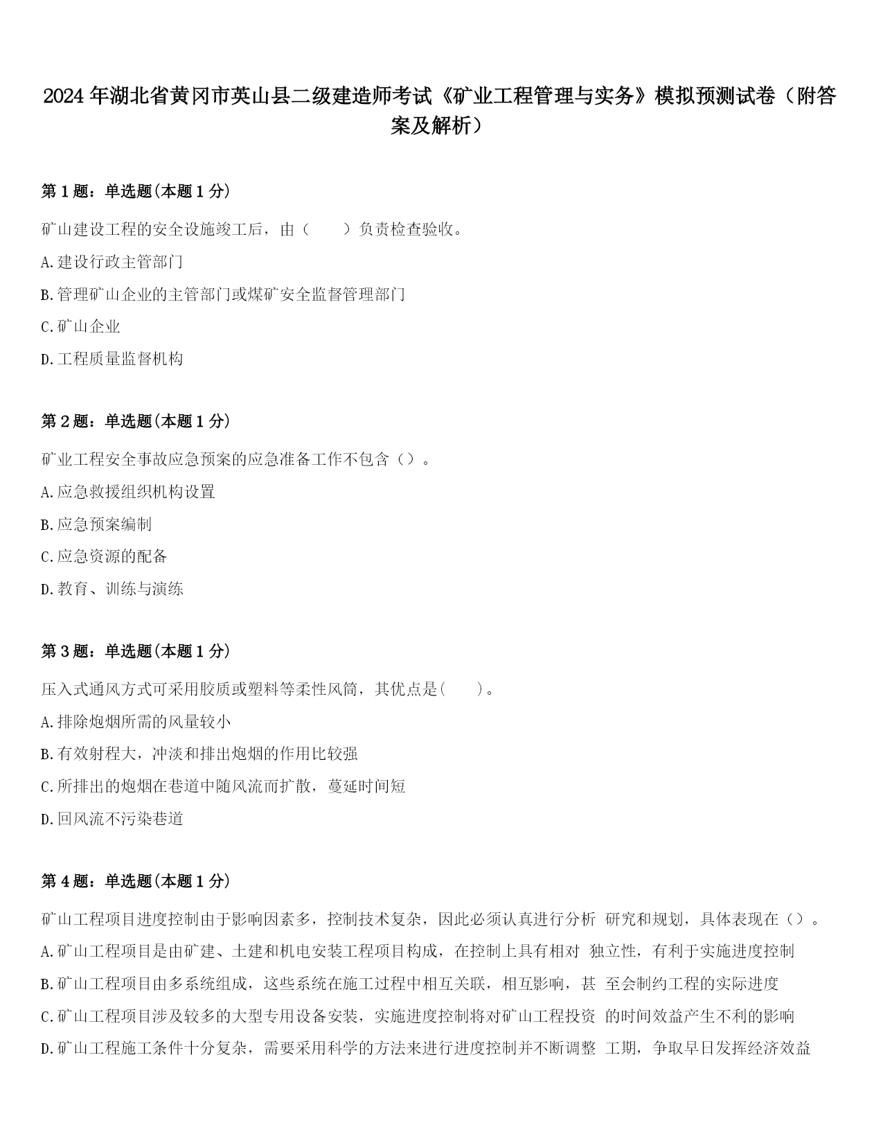 2024年湖北省黄冈市英山县二级建造师考试《矿业工程管理与实务》模拟预测试卷(附答案及解析)第1题:单选题(本题1分)矿山建设工程的安全设施竣工后,由()负责检查验收。A.建设行政主管部门B.管理矿山企业的主管部门或煤矿安全监督管理部门C.矿山企业D.工程质量监督机构第2题:单选题(本题1分)矿业工程安全事故应急预案的应急准备工作不包含()。A.应急救援组织机构设置B.应急预案编制C.应急资源的配备D.教育、训练与演练第3题:单选题(本题1分)压入式通风方式可采用胶质或塑料等柔性风筒,其优点是()。A.排