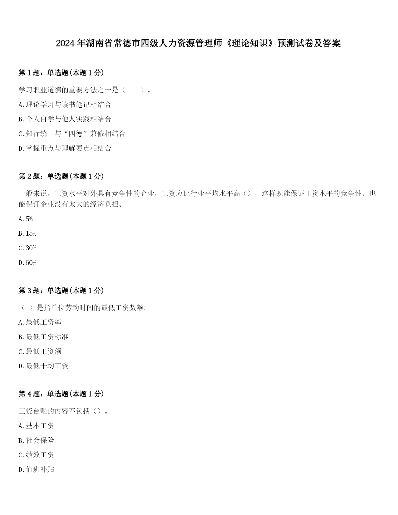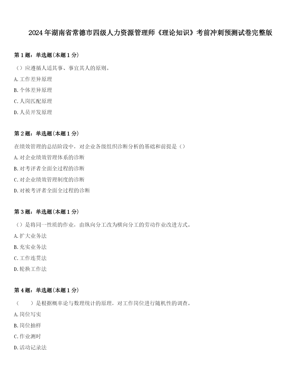 2024年湖南省常德市四级人力资源管理师《理论知识》考前冲刺预测试卷完整版.docx