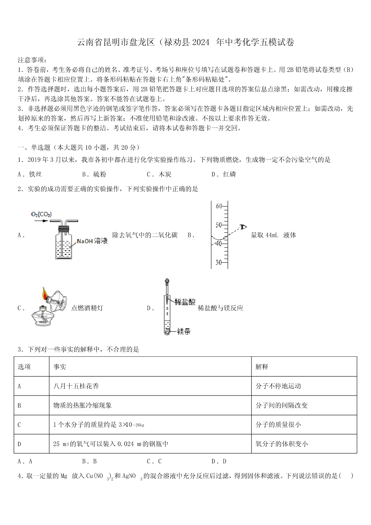 云南省昆明市盘龙区(禄劝县2024年中考化学五模试卷注意事项:1.答卷前,考生务必将自己的姓名、准考证号、考场号和座位号填写在试题卷和答题卡上。用2B铅笔将试卷类型(B)填涂在答题卡相应位置上。将条形码粘贴在答题卡右上角"条形码粘贴处"。2.作答选择题时,选出每小题答案后,用2B铅笔把答题卡上对应题目选项的答案信息点涂黑;如需改动,用橡皮擦干净后,再选涂其他答案。答案不能答在试题卷上。3.非选择题必须用黑色字迹的钢笔或签字笔作答,答案必须写在答题卡各题目指定区域内相应位置上;如需改动,先划掉原来的答案,然