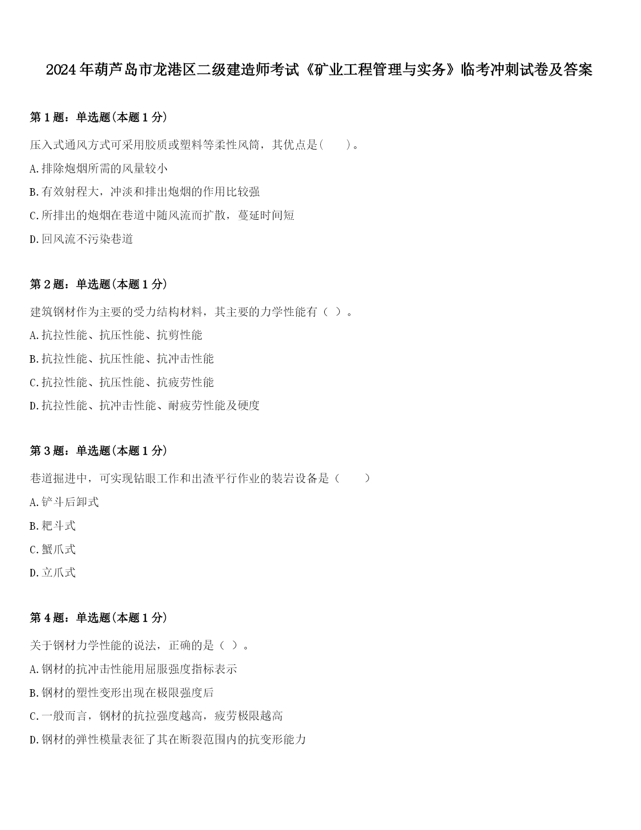 2024年葫芦岛市龙港区二级建造师考试《矿业工程管理与实务》临考冲刺试卷及答案第1题:单选题(本题1分)压入式通风方式可采用胶质或塑料等柔性风筒,其优点是()。A.排除炮烟所需的风量较小B.有效射程大,冲淡和排出炮烟的作用比较强C.所排出的炮烟在巷道中随风流而扩散,蔓延时间短D.回风流不污染巷道第2题:单选题(本题1分)建筑钢材作为主要的受力结构材料,其主要的力学性能有()。A.抗拉性能、抗压性能、抗剪性能B.抗拉性能、抗压性能、抗冲击性能C.抗拉性能、抗压性能、抗疲劳性能D.抗拉性能、抗冲击性能、耐疲劳