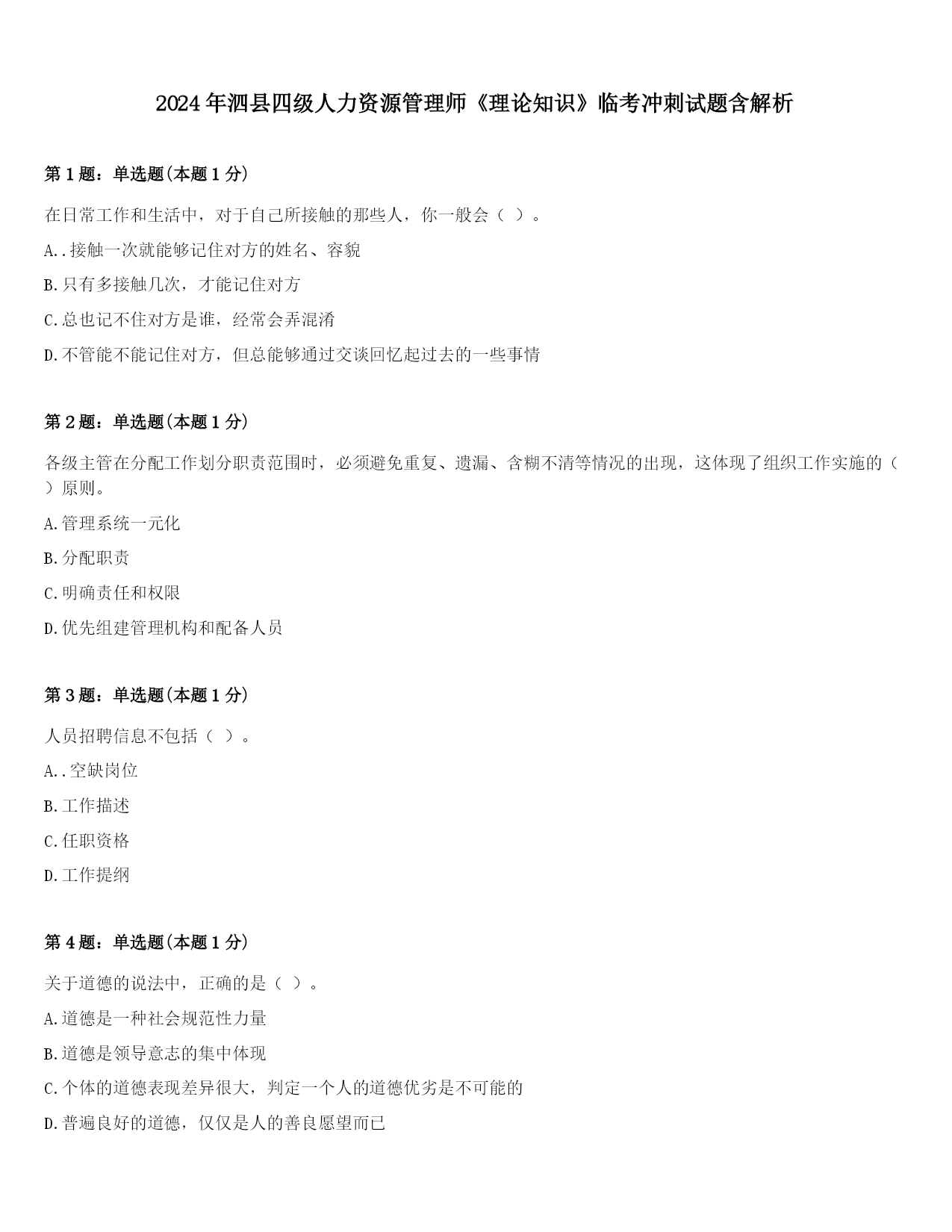 2024年泗县四级人力资源管理师《理论知识》临考冲刺试题含解析.docx