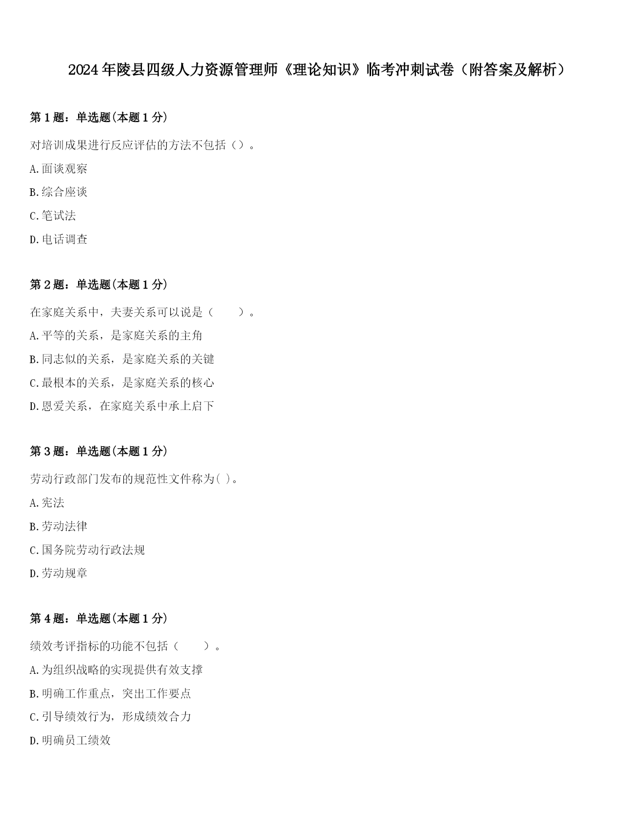 2024年陵县四级人力资源管理师《理论知识》临考冲刺试卷(附答案及解析).docx
