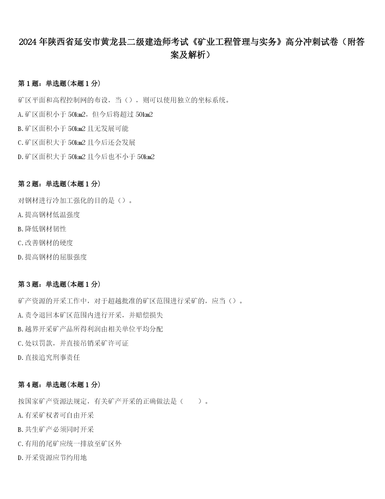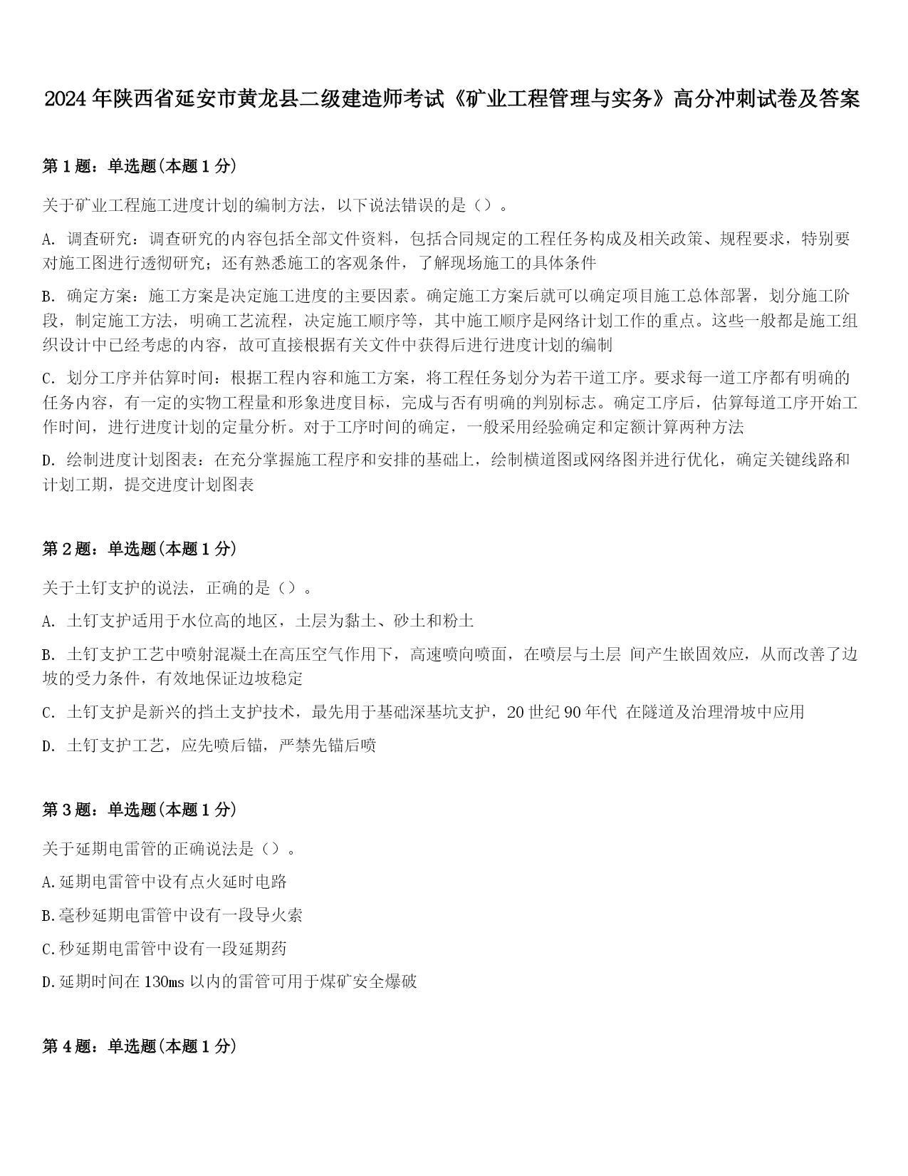 2024年陕西省延安市黄龙县二级建造师考试《矿业工程管理与实务》高分冲刺试卷及答案.docx