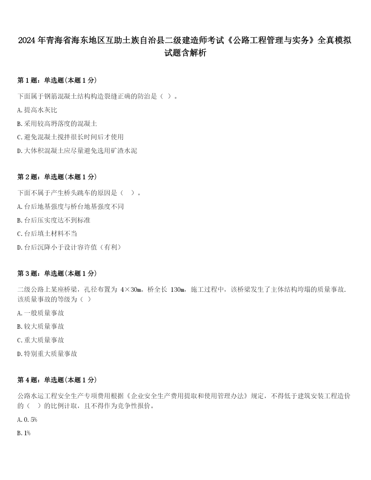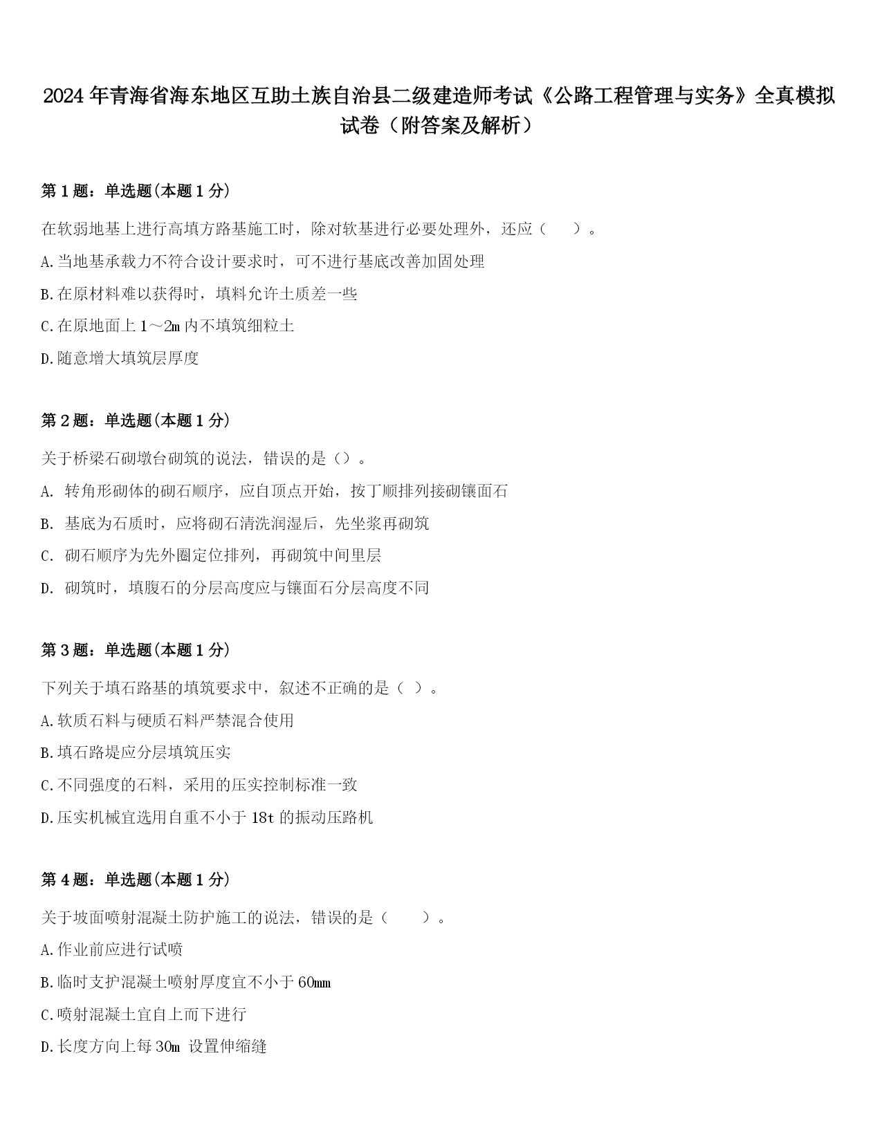 2024年青海省海东地区互助土族自治县二级建造师考试《公路工程管理与实务》全真模拟试卷(附答案及解析).docx