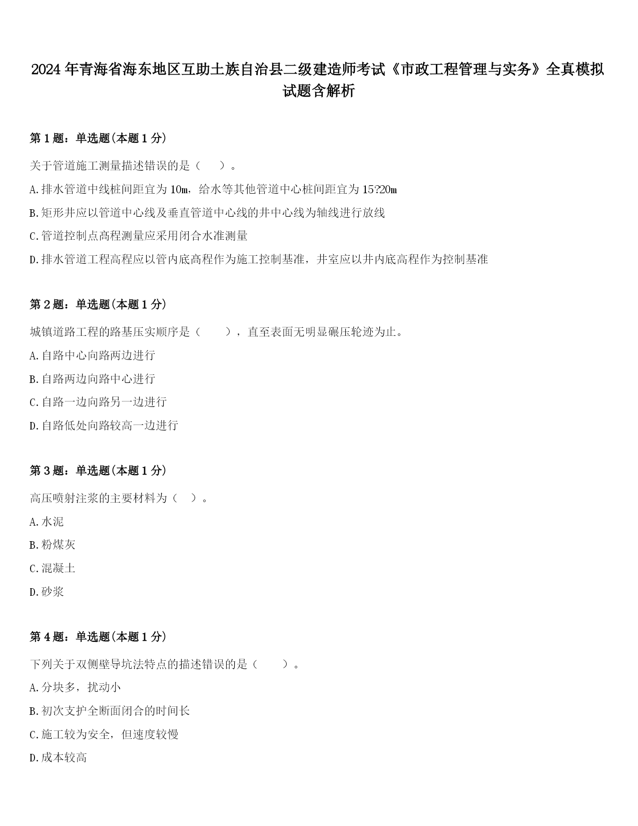 2024年青海省海东地区互助土族自治县二级建造师考试《市政工程管理与实务》全真模拟试题(附答案及解析).docx