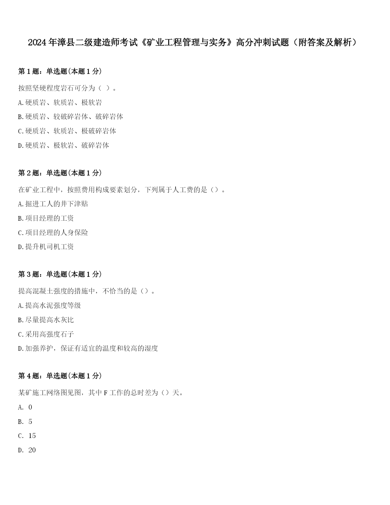2024年漳县二级建造师考试《矿业工程管理与实务》高分冲刺试题(附答案及解析)第1题:单选题(本题1分)按照坚硬程度岩石可分为()。A.硬质岩、软质岩、极软岩B.硬质岩、较破碎岩体、破碎岩体C.硬质岩、软质岩、极破碎岩体D.硬质岩、极软岩、破碎岩体第2题:单选题(本题1分)在矿业工程中,按照费用构成要素划分,下列属于人工费的是()。A.掘进工人的井下津贴B.项目经理的工资C.项目经理的人身保险D.提升机司机工资第3题:单选题(本题1分)提高混凝土强度的措施中,不恰当的是()。A.提高水泥强度等级B.尽量提