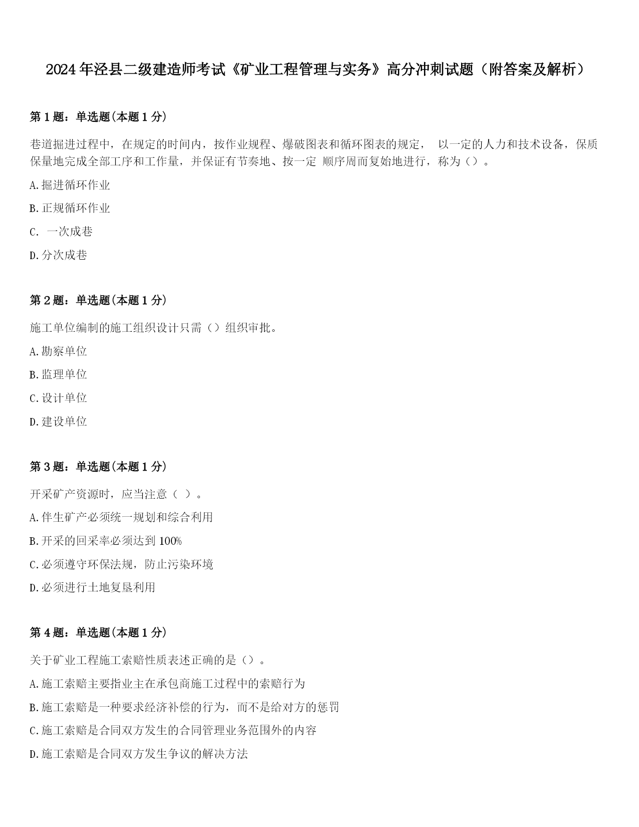 2024年泾县二级建造师考试《矿业工程管理与实务》高分冲刺试题(附答案及解析).docx