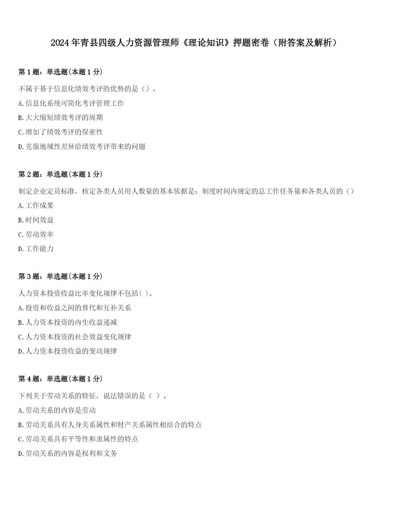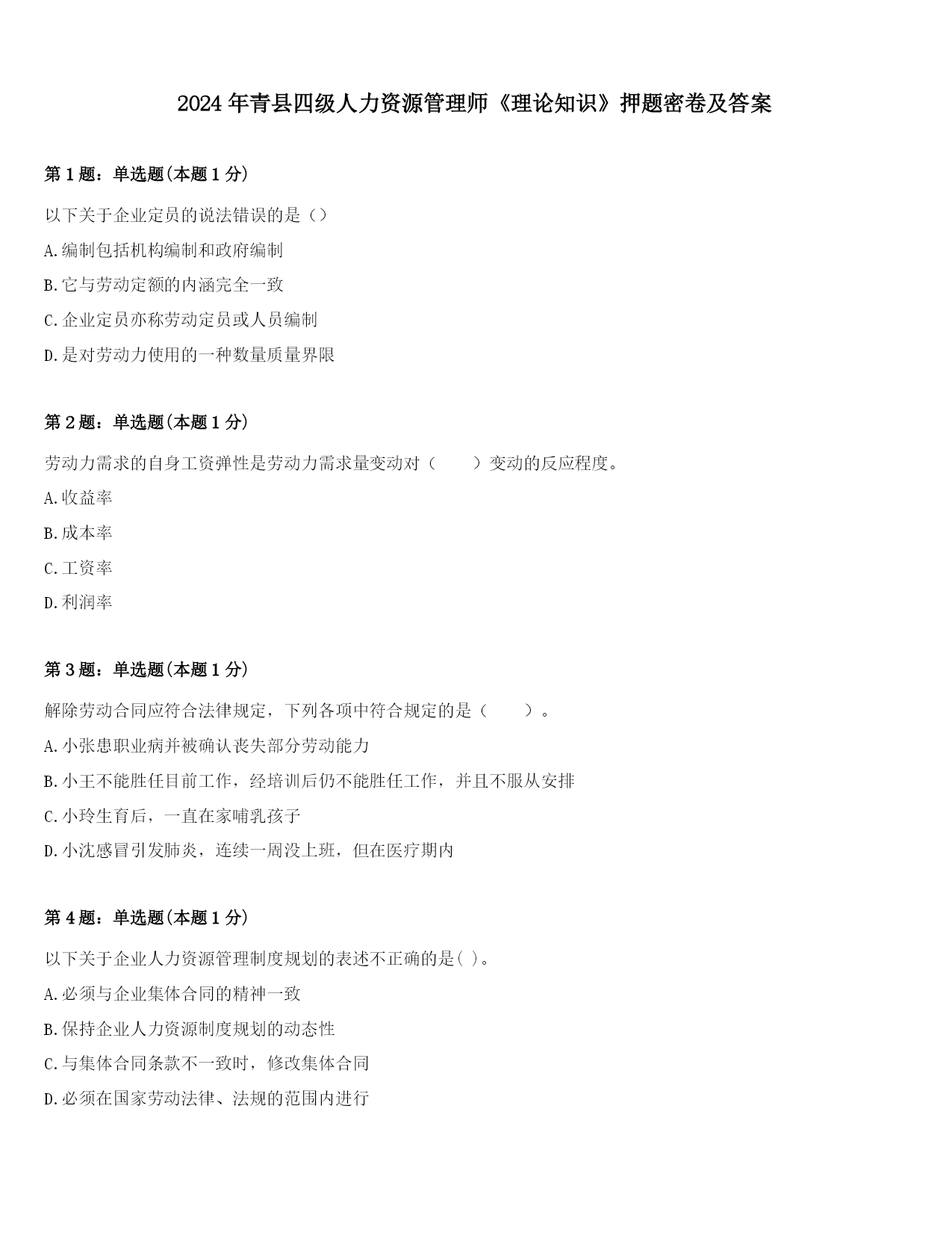 2024年青县四级人力资源管理师《理论知识》押题密卷含解析.docx