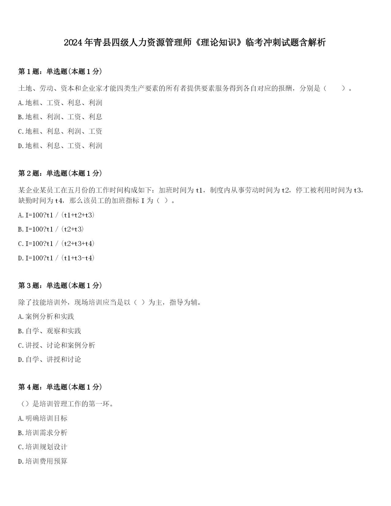 2024年青县四级人力资源管理师《理论知识》临考冲刺试题含解析第1题:单选题(本题1分)土地、劳动、资本和企业家才能四类生产要素的所有者提供要素服务得到各自对应的报酬,分别是()。A.地租、工资、利息、利润B.地租、利润、工资、利息C.地租、利息、利润、工资D.地租、利息、工资、利润第2题:单选题(本题1分)某企业某员工在五月份的工作时间构成如下:加班时间为t1,制度内从事劳动时间为t2,停工被利用时间为t3,缺勤时间为t4,那么该员工的加班指标I为()。A.I=100?t1/(t1+t2+t3)B.I=