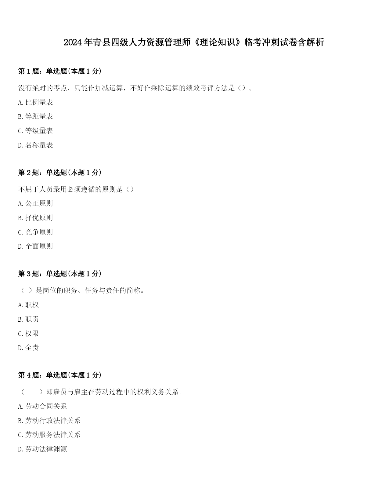 2024年青县四级人力资源管理师《理论知识》临考冲刺试卷含解析第1题:单选题(本题1分)没有绝对的零点,只能作加减运算,不好作乘除运算的绩效考评方法是()。A.比例量表B.等距量表C.等级量表D.名称量表第2题:单选题(本题1分)不属于人员录用必须遵循的原则是()A.公正原则B.择优原则C.竞争原则D.全面原则第3题:单选题(本题1分)()是岗位的职务、任务与责任的简称。A.职权B.职责C.权限D.全责第4题:单选题(本题1分)()即雇员与雇主在劳动过程中的权利义务关系。A.劳动合同关系B.劳动行政法律关