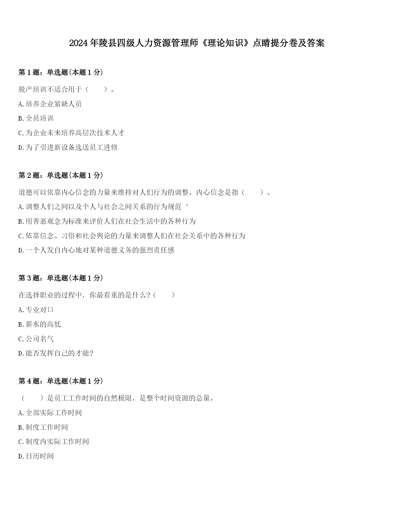 2024年陵县四级人力资源管理师《理论知识》点睛提分卷及答案第1题:单选题(本题1分)脱产培训不适合用于()。A.培养企业紧缺人员B.全员培训C.为企业未来培养高层次技术人才D.为了引进新设备选送员工进修第2题:单选题(本题1分)道德可以依靠内心信念的力量来维持对人们行为的调整。内心信念是指()。A.调整人们之间以及个人与社会之间关系的行为规范‘B.用善恶观念为标准来评价人们在社会生活中的各种行为C.依靠信念、习俗和社会舆论的力量来调整人们在社会关系中的各种行为D.一个人发自内心地对某种道德义务的强烈责任