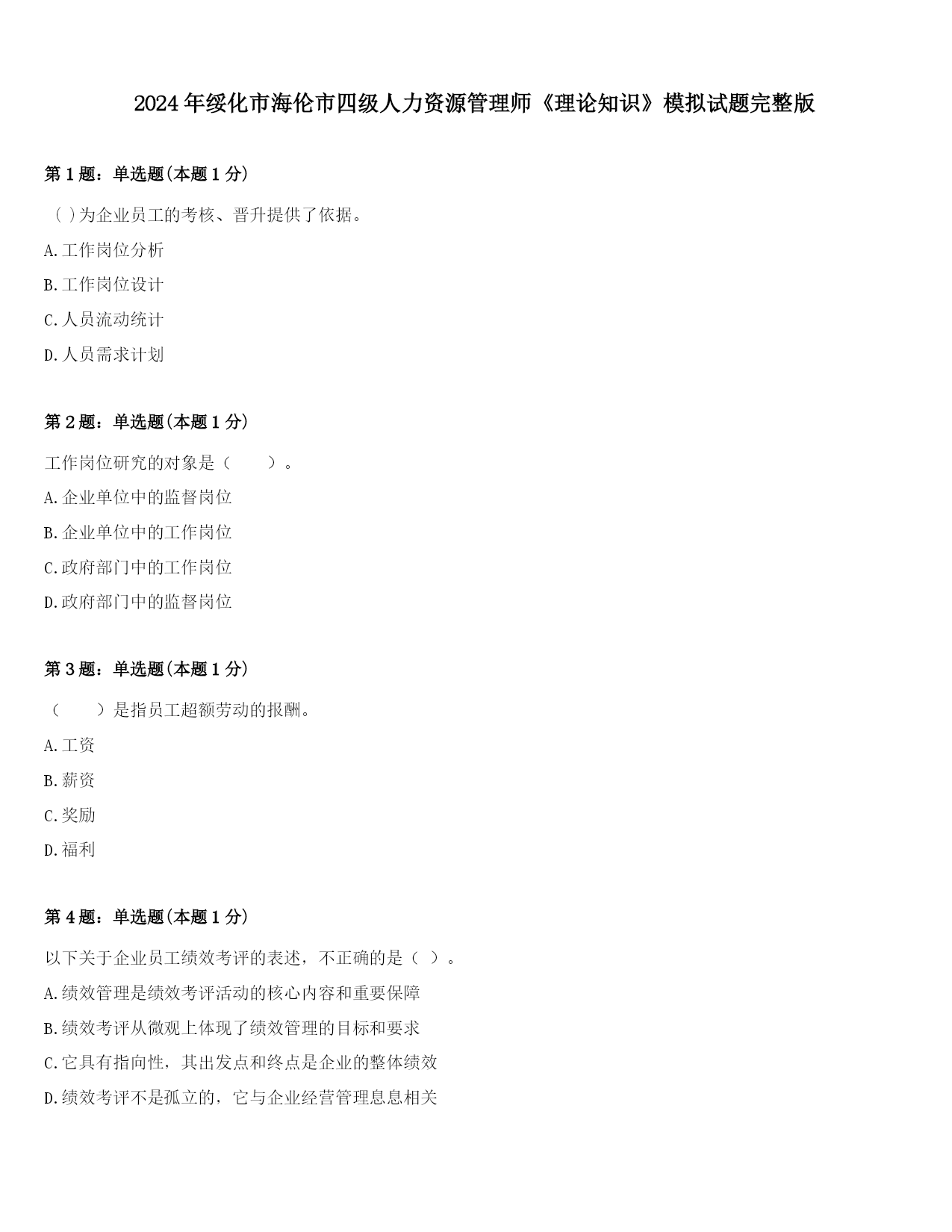 2024年绥化市海伦市四级人力资源管理师《理论知识》模拟试题完整版第1题:单选题(本题1分)()为企业员工的考核、晋升提供了依据。A.工作岗位分析B.工作岗位设计C.人员流动统计D.人员需求计划第2题:单选题(本题1分)工作岗位研究的对象是()。A.企业单位中的监督岗位B.企业单位中的工作岗位C.政府部门中的工作岗位D.政府部门中的监督岗位第3题:单选题(本题1分)()是指员工超额劳动的报酬。A.工资B.薪资C.奖励D.福利第4题:单选题(本题1分)以下关于企业员工绩效考评的表述,不正确的是()。A.绩效