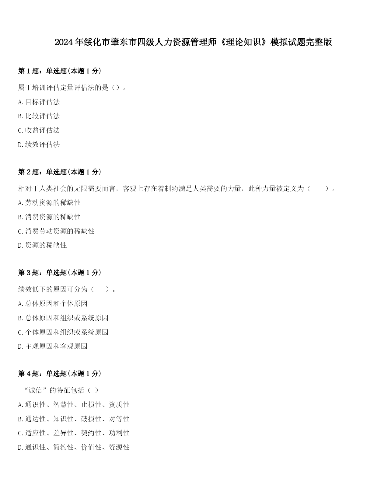 2024年绥化市肇东市四级人力资源管理师《理论知识》模拟试题完整版第1题:单选题(本题1分)属于培训评估定量评估法的是()。A.目标评估法B.比较评估法C.收益评估法D.绩效评估法第2题:单选题(本题1分)相对于人类社会的无限需要而言,客观上存在着制约满足人类需要的力量,此种力量被定义为()。A.劳动资源的稀缺性B.消费资源的稀缺性C.消费劳动资源的稀缺性D.资源的稀缺性第3题:单选题(本题1分)绩效低下的原因可分为()。A.总体原因和个体原因B.总体原因和组织或系统原因C.个体原因和组织或系统原因D.主