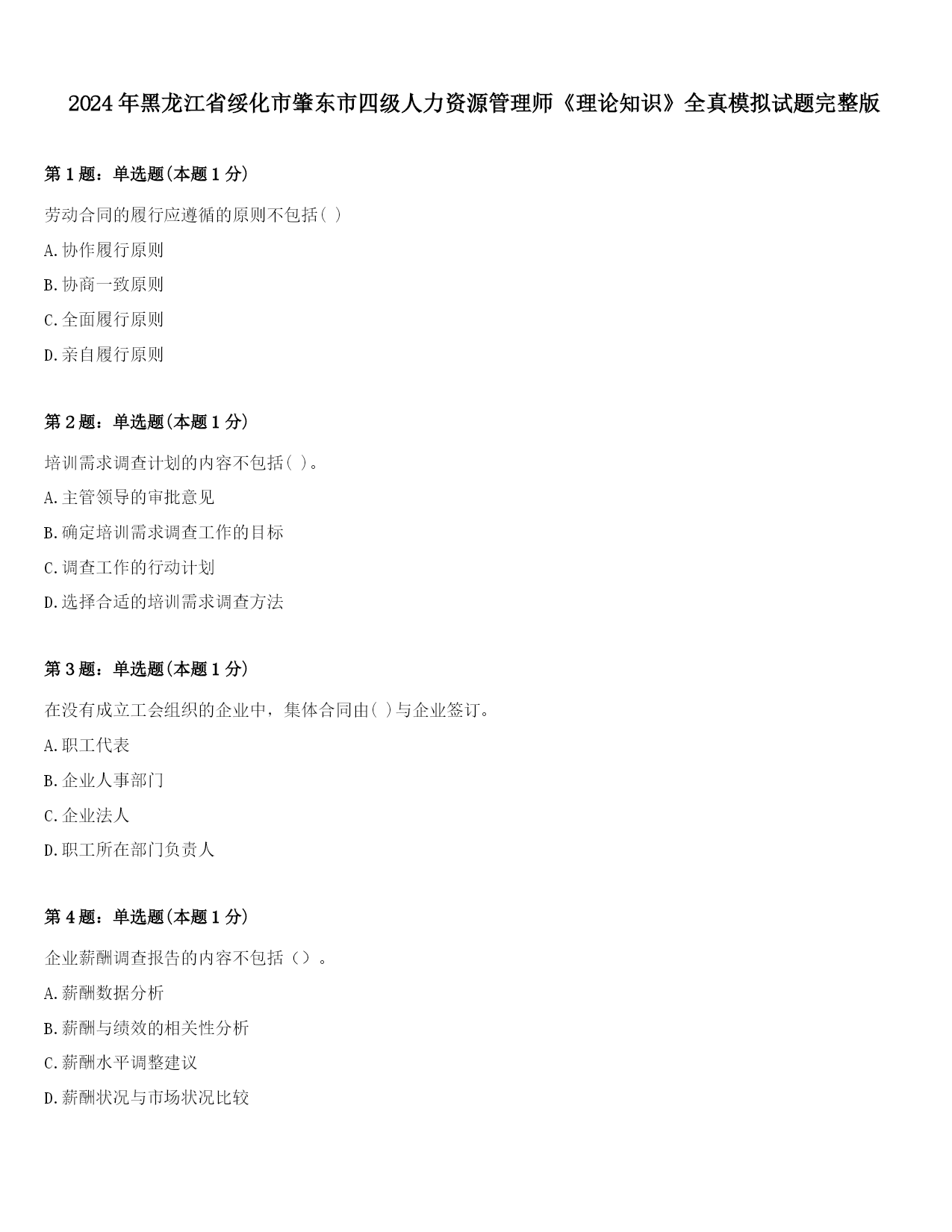 2024年黑龙江省绥化市肇东市四级人力资源管理师《理论知识》全真模拟试题完整版第1题:单选题(本题1分)劳动合同的履行应遵循的原则不包括()A.协作履行原则B.协商一致原则C.全面履行原则D.亲自履行原则第2题:单选题(本题1分)培训需求调查计划的内容不包括()。A.主管领导的审批意见B.确定培训需求调查工作的目标C.调查工作的行动计划D.选择合适的培训需求调查方法第3题:单选题(本题1分)在没有成立工会组织的企业中,集体合同由()与企业签订。A.职工代表B.企业人事部门C.企业法人D.职工所在部门负责人