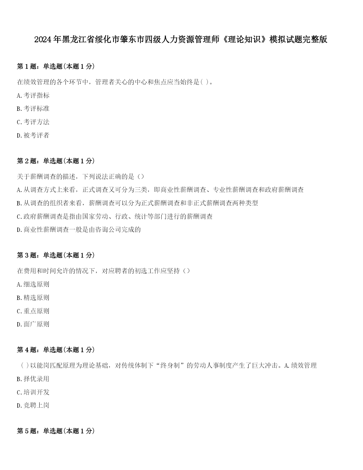 2024年黑龙江省绥化市肇东市四级人力资源管理师《理论知识》模拟试题完整版第1题:单选题(本题1分)在绩效管理的各个环节中,管理者关心的中心和焦点应当始终是()。A.考评指标B.考评标准C.考评方法D.被考评者第2题:单选题(本题1分)关于薪酬调查的描述,下列说法正确的是()A.从调查方式上来看,正式调查又可分为三类,即商业性薪酬调查、专业性薪酬调查和政府薪酬调查B.从调查的组织者来看,薪酬调查可以分为正式薪酬调查和非正式薪酬调查两种类型C.政府薪酬调查是指由国家劳动、行政、统计等部门进行的薪酬调查D.商
