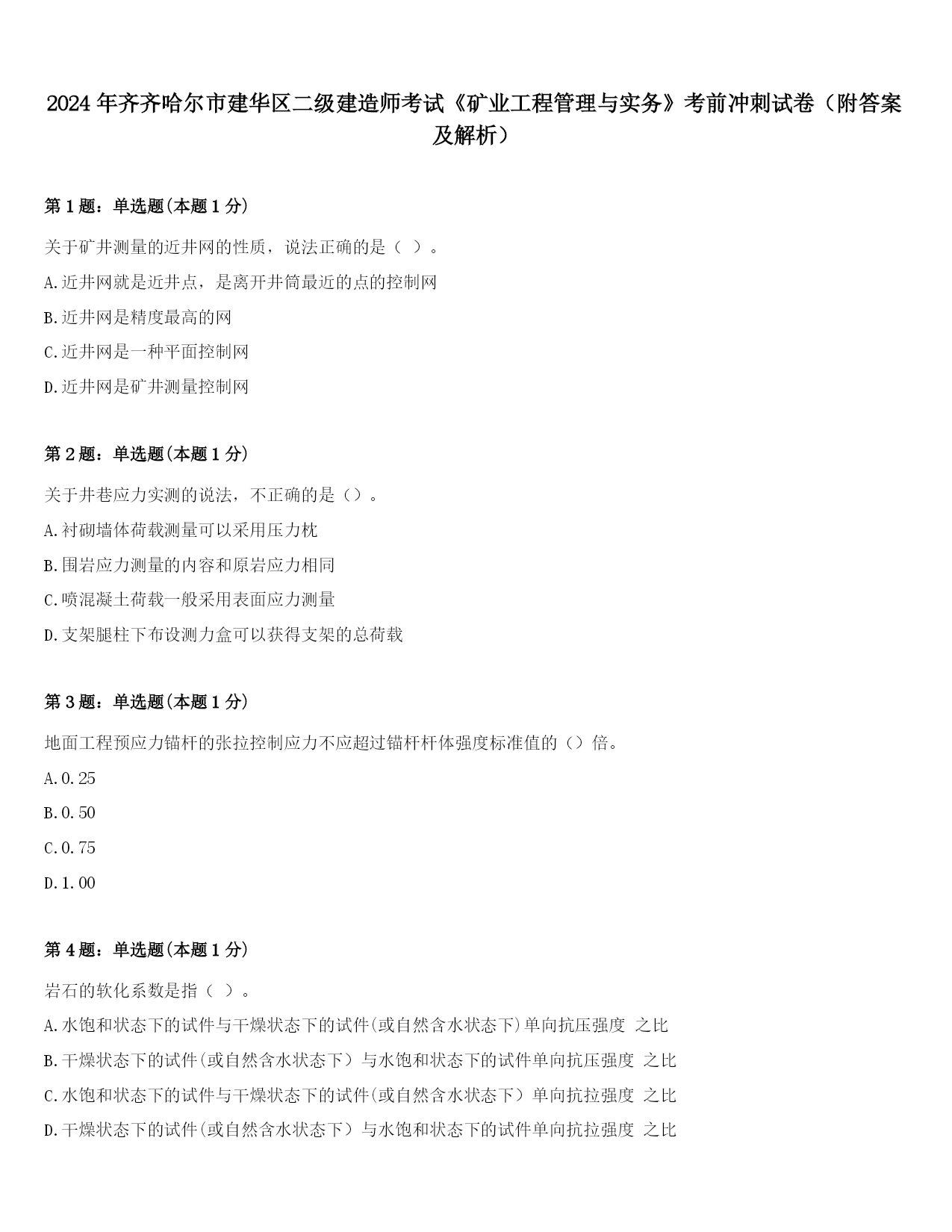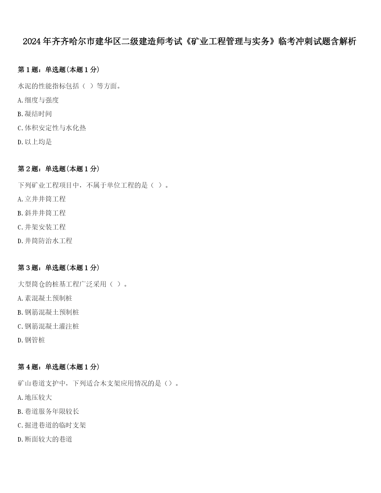 2024年齐齐哈尔市建华区二级建造师考试《矿业工程管理与实务》临考冲刺试卷完整版.docx