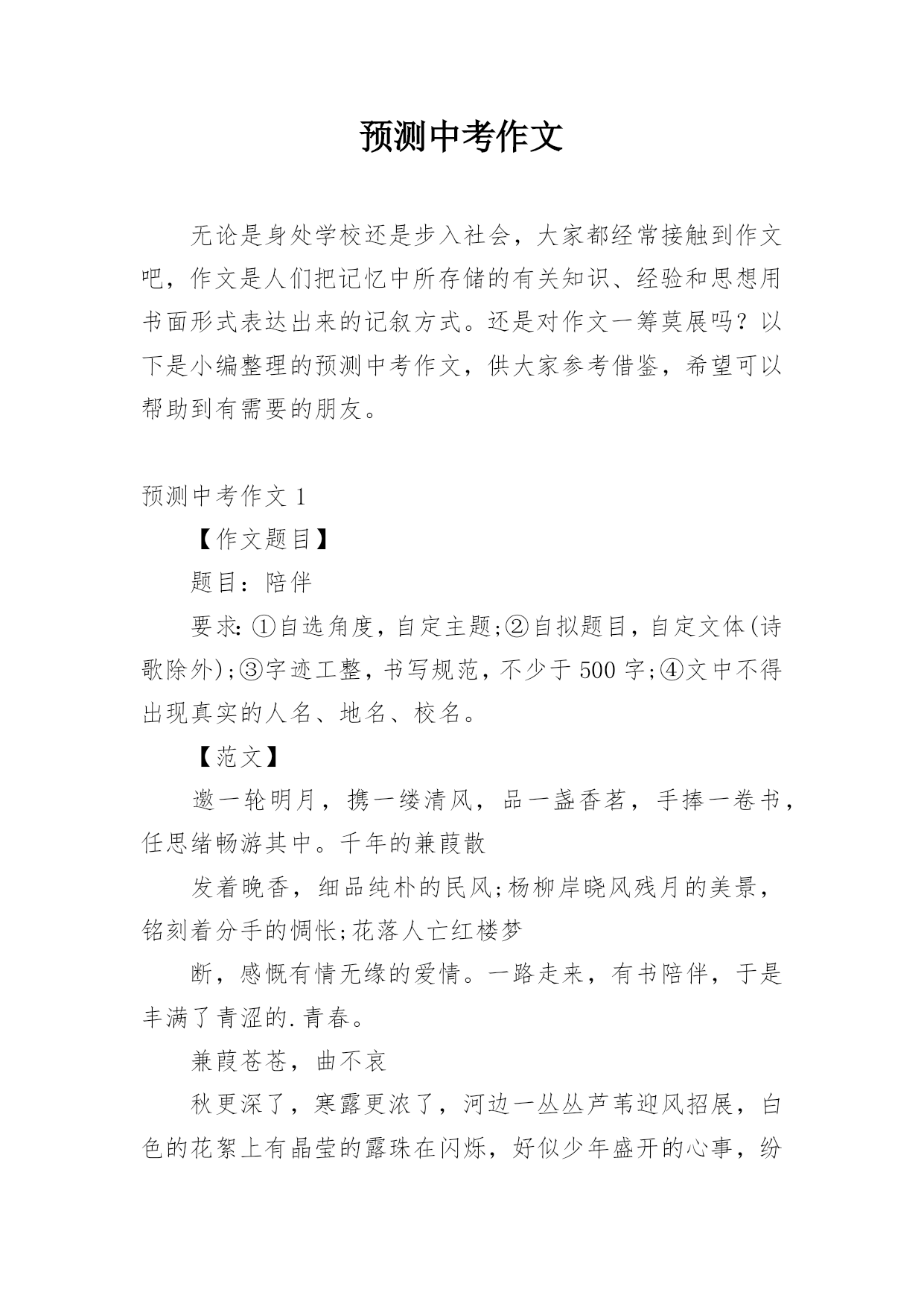 预测中考作文无论是身处学校还是步入社会,大家都经常接触到作文吧,作文是人们把记忆中所存储的有关知识、经验和思想用书面形式表达出来的记叙方式。还是对作文一筹莫展吗?以下是小编整理的预测中考作文,供大家参考借鉴,希望可以帮助到有需要的朋友。预测中考作文1【作文题目】题目:陪伴要求:①自选角度,自定主题;②自拟题目,自定文体(诗歌除外);③字迹工整,书写规范,不少于500字;④文中不得出现真实的人名、地名、校名。【范文】邀一轮明月,携一缕清风,品一盏香茗,手捧一卷书,任思绪畅游其中。千年的兼葭散发着晚香,细品纯