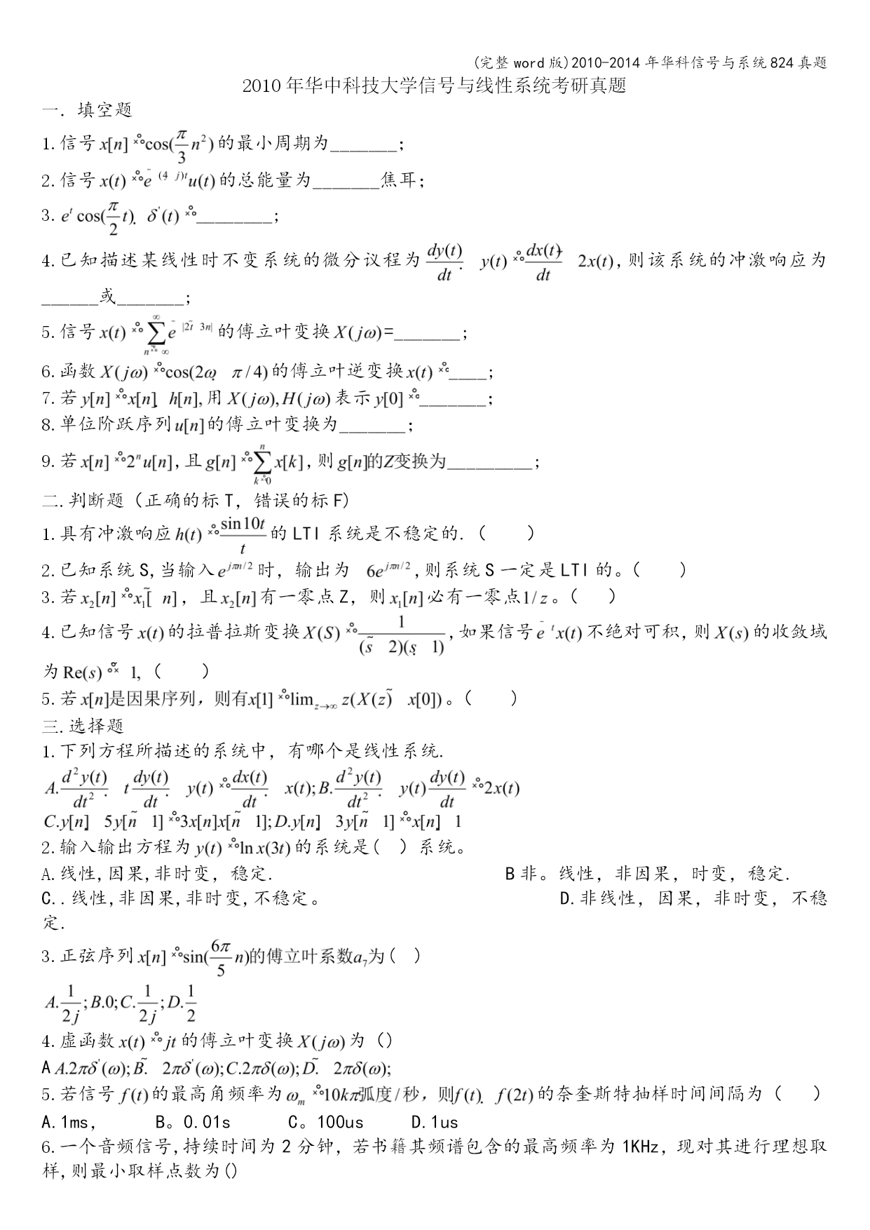 (完整word版)2010-2014年华科信号与系统824真题(完整word版)2010-2014年华科信号与系统824真题(完整word版)2010-2014年华科信号与系统824真题2010年华中科技大学信号与线性系统考研真题填空题信号的最小周期为_______;信号的总能量为_______焦耳;________;已知描述某线性时不变系统的微分议程为,则该系统的冲激响应为______或_______;信号的傅立叶变换=_______;函数的傅立叶逆变换____;若用表示_______;单位阶跃序列的傅