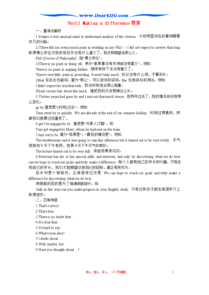 用心爱心专心117号编辑1Unit1Makingadifference教案一、重难点解析1.Ittakesaveryunusualmindtounderstandanalysisoftheobvious.分析明显存在的事物需要非凡的头脑。2.(Theredidnotseem)muchpointinworkingonmyPhD---Ididnotexpecttosurvive